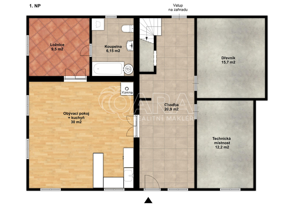V přízemí se na ploše cca 100 m2 nachází kuchyně s obývacím pokojem, ložnice a koupelna s wc. K dispozici je také technická místnost a dřevník.