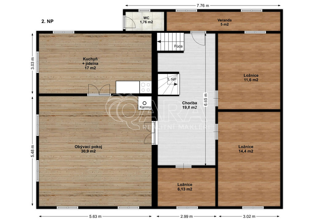 Druhé patro o velikosti cca 107 m2 nabízí obývací pokoj, kuchyni s jídelnou, tři oddělené ložnice, verandu a wc.