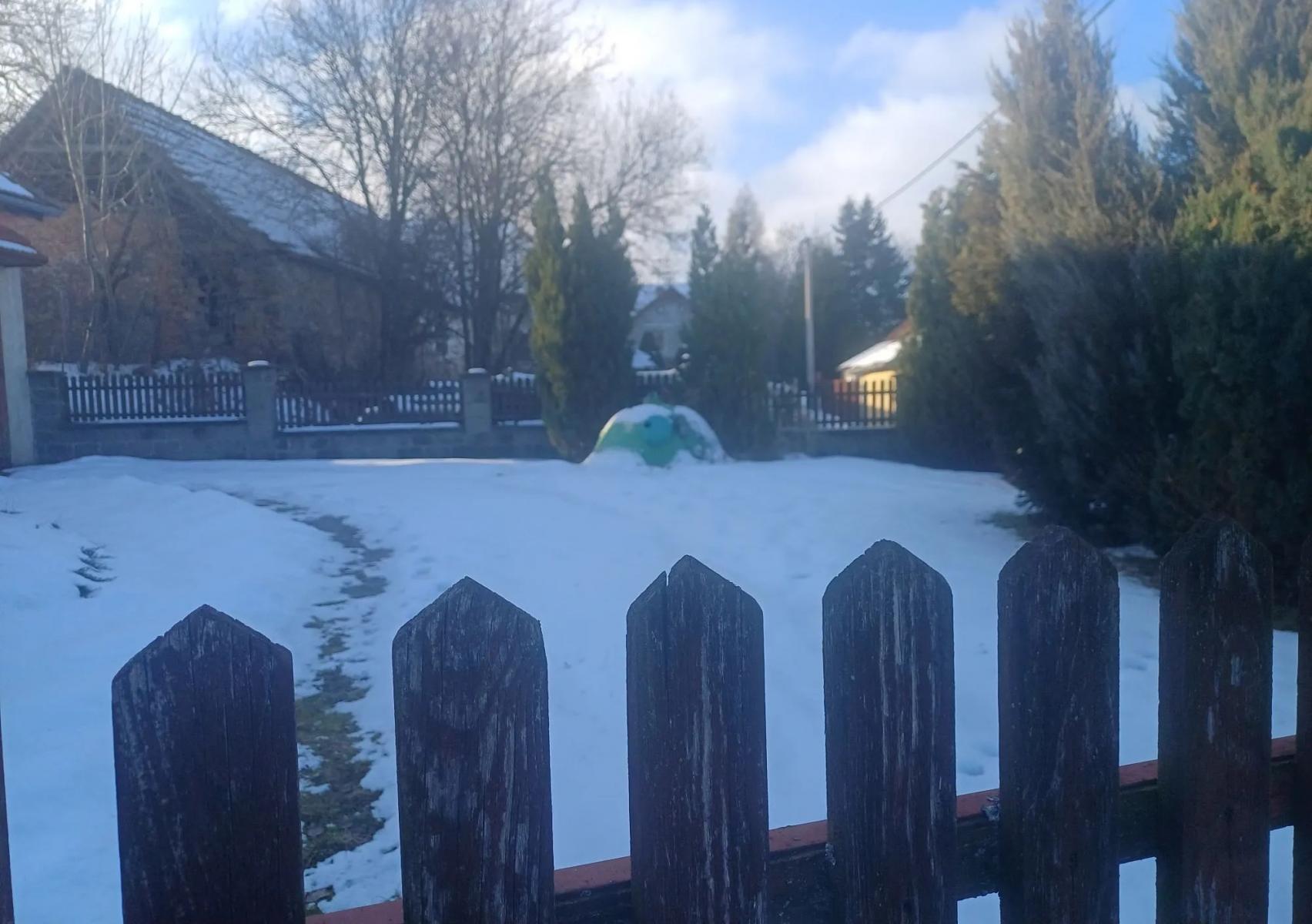 Celý pozemek je oplocený, příjezd je po obecním pozemku k vratům.