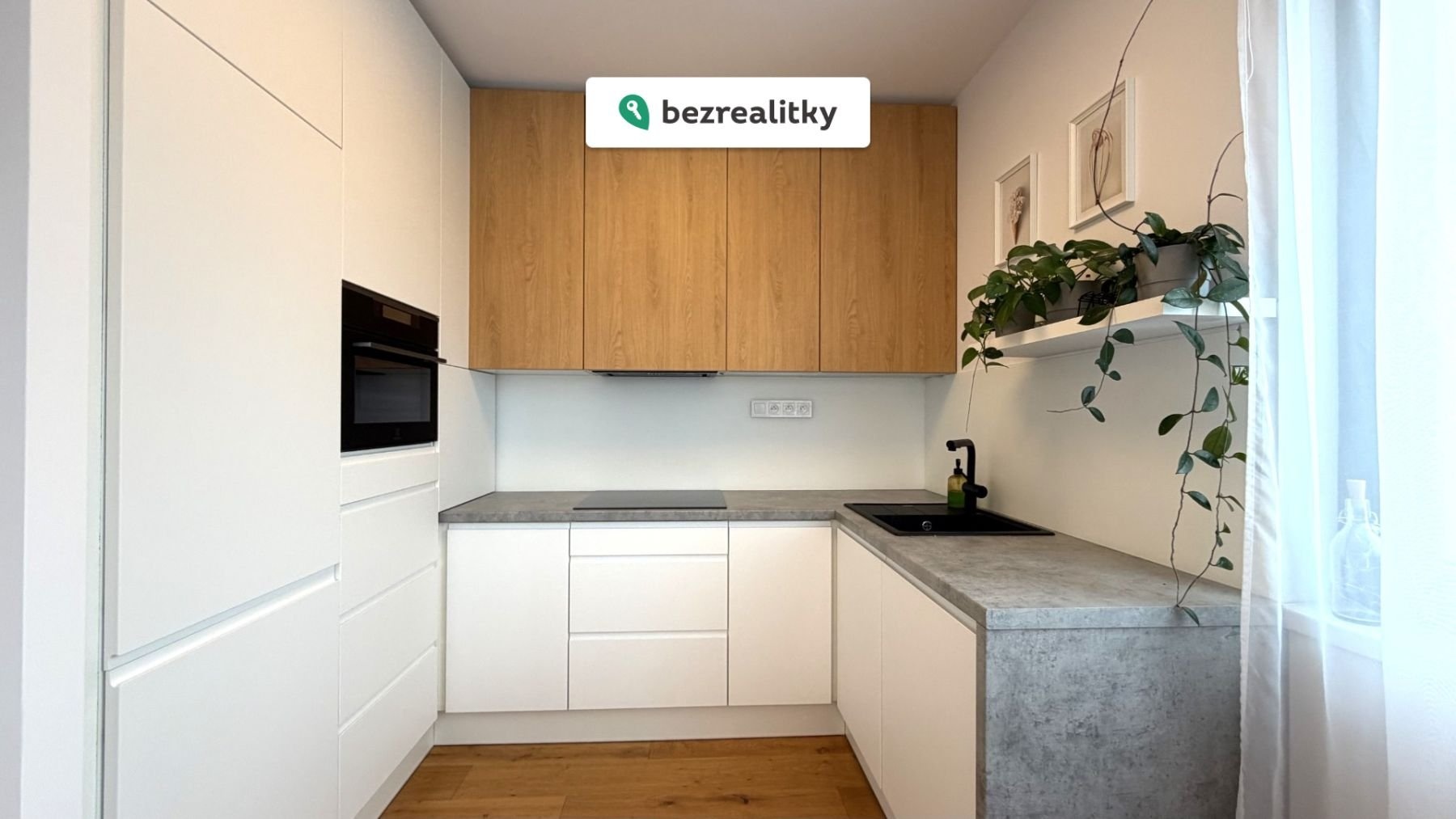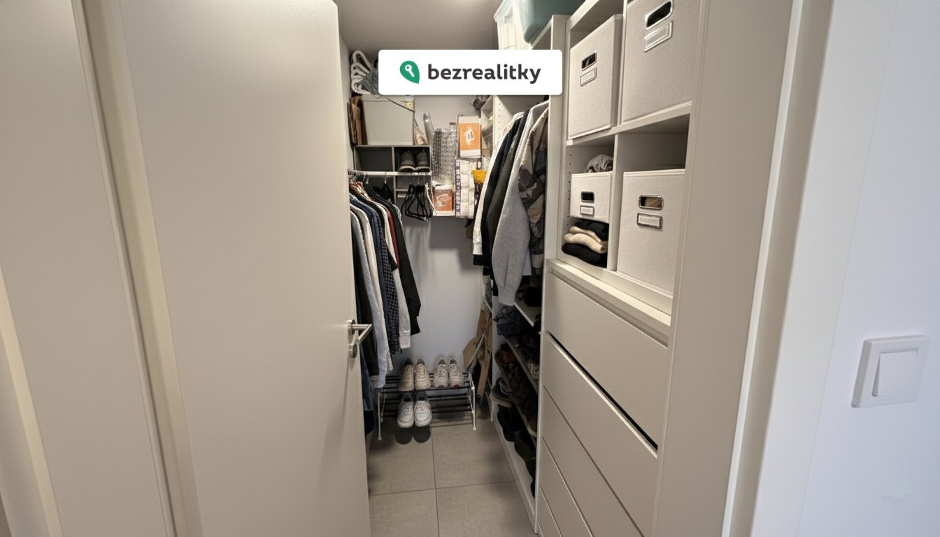 Vstupní hala zároveň propojuje všechny místnosti a díky samostatné šatně s nábytkem na míru nabízí velké množství úložného prostoru. Obývací pokoj s kuchyňským koutem je propojen s balkonem orientovaným do klidné části domu. kuchyňská linka od truhláře je vybavena moderními vestavnými spotřebiči a poskytuje dostatek pracovní plochy i úložného místa. Ložnice s velkou vestavnou skříní a komodou působí útulně a harmonicky.