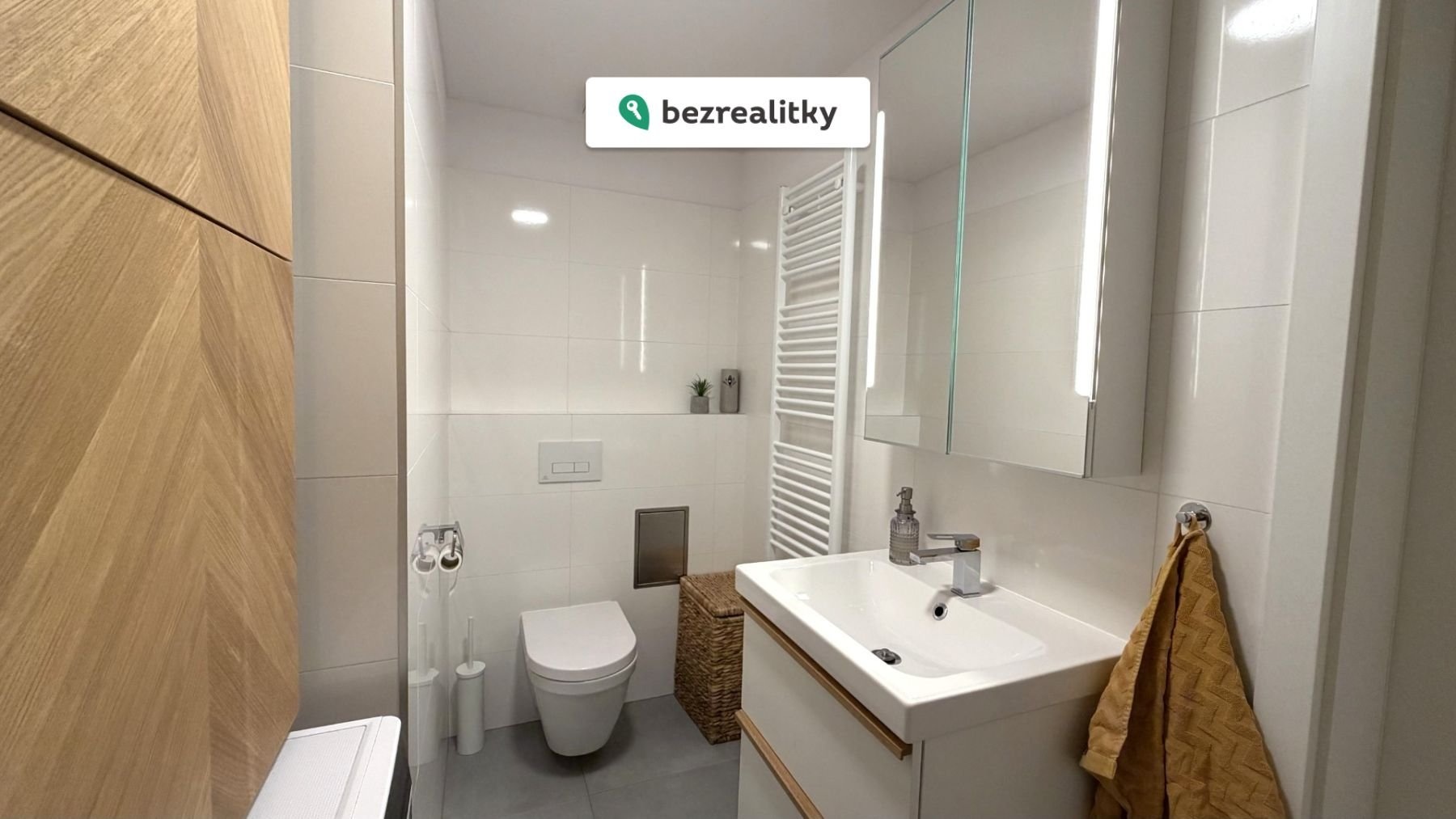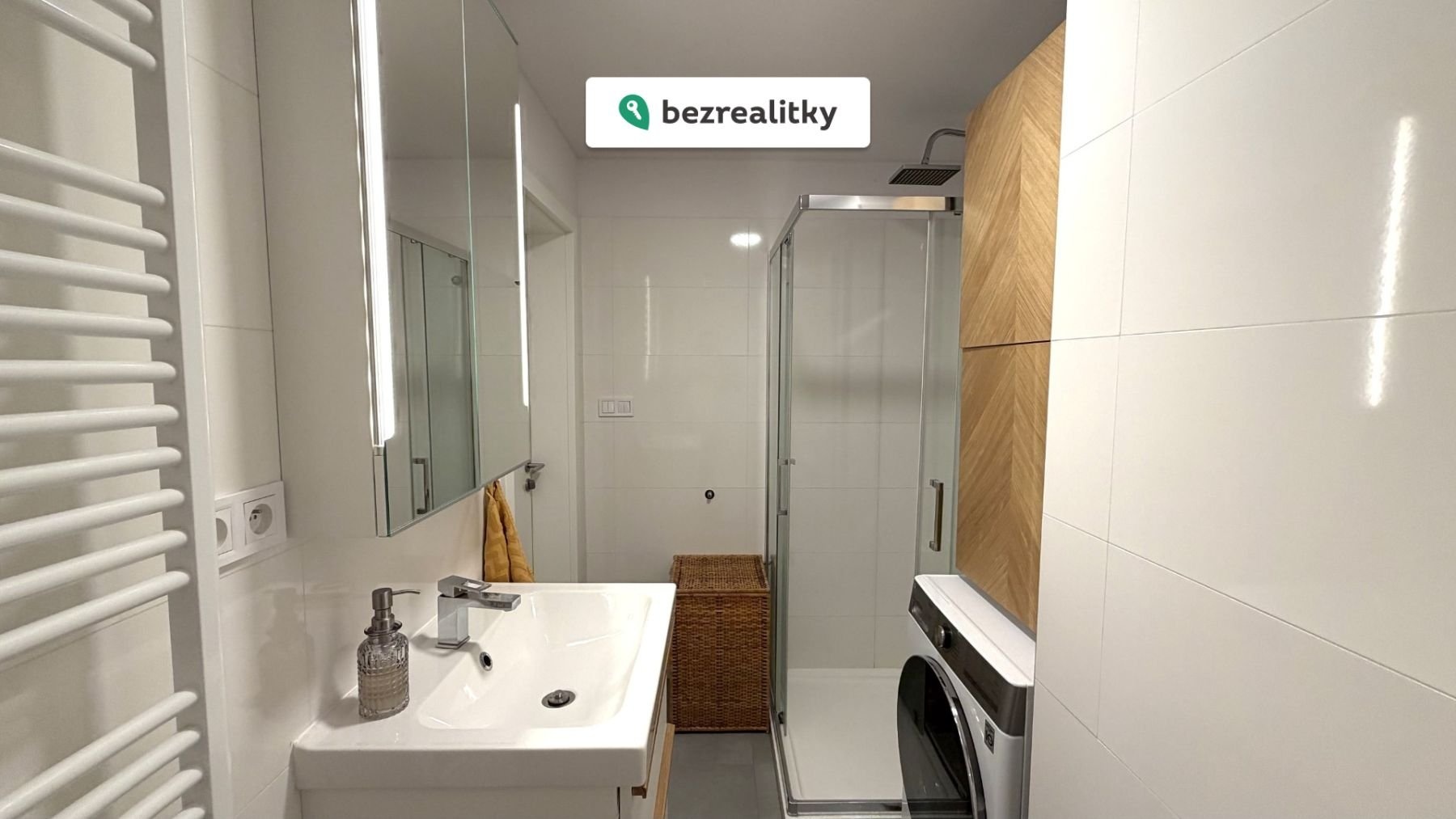 Koupelna je vybavena kvalitními sanitárními prvky, sprchovým koutem, závěsným WC, umyvadlovou skříňkou a přípojkou na pračku i sušičku.