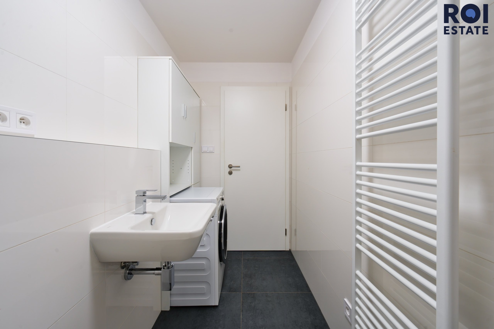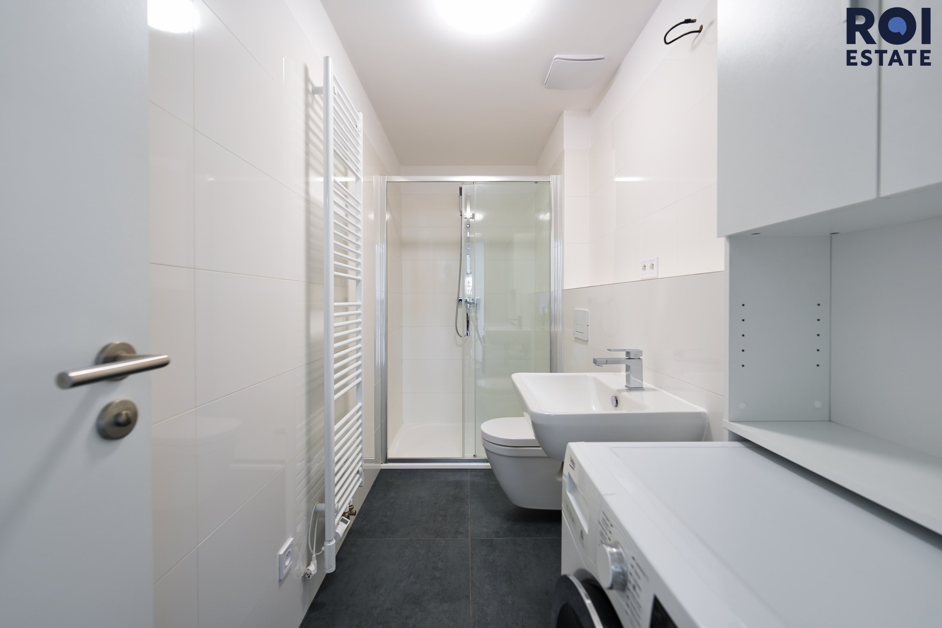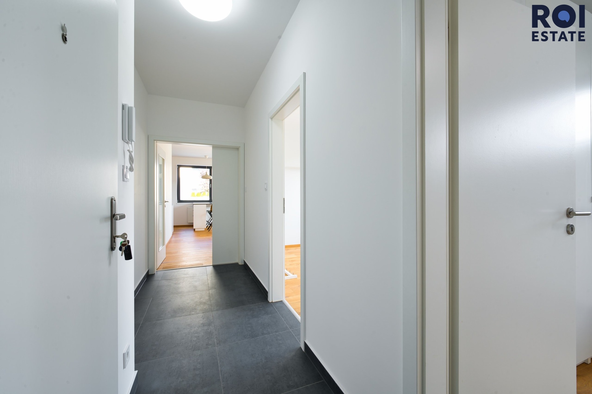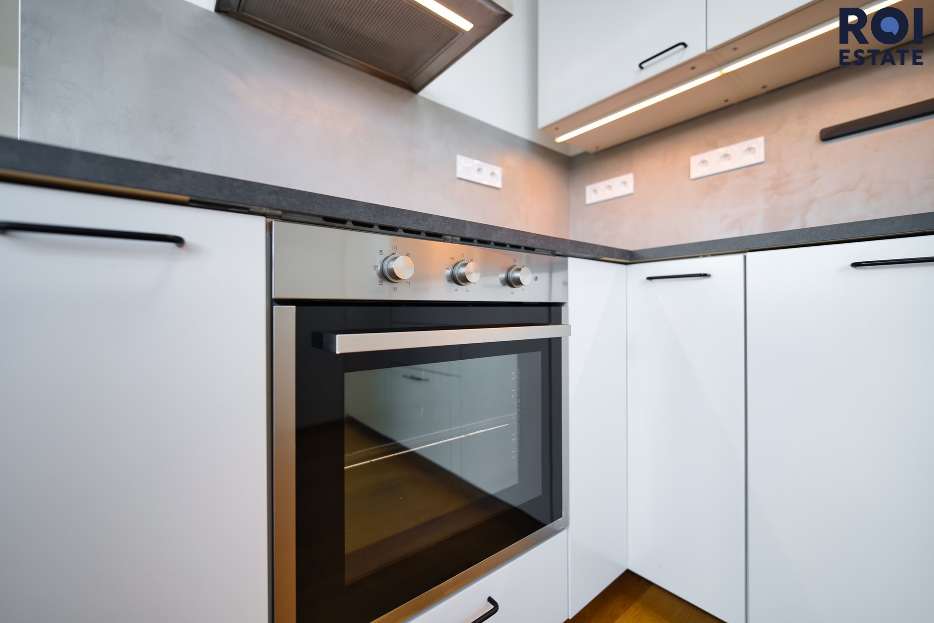 Byt je vybaven moderní kuchyňskou linkou s vestavěnými spotřebiči včetně myčky, lednice s mrazákem, elektrické trouby a indukční varné desky. Ve dvou koupelnách naleznete sprchový kout a toaletu. Prostorná chodba je vybavena vestavěnou skříní poskytující spoustu úložného prostoru.