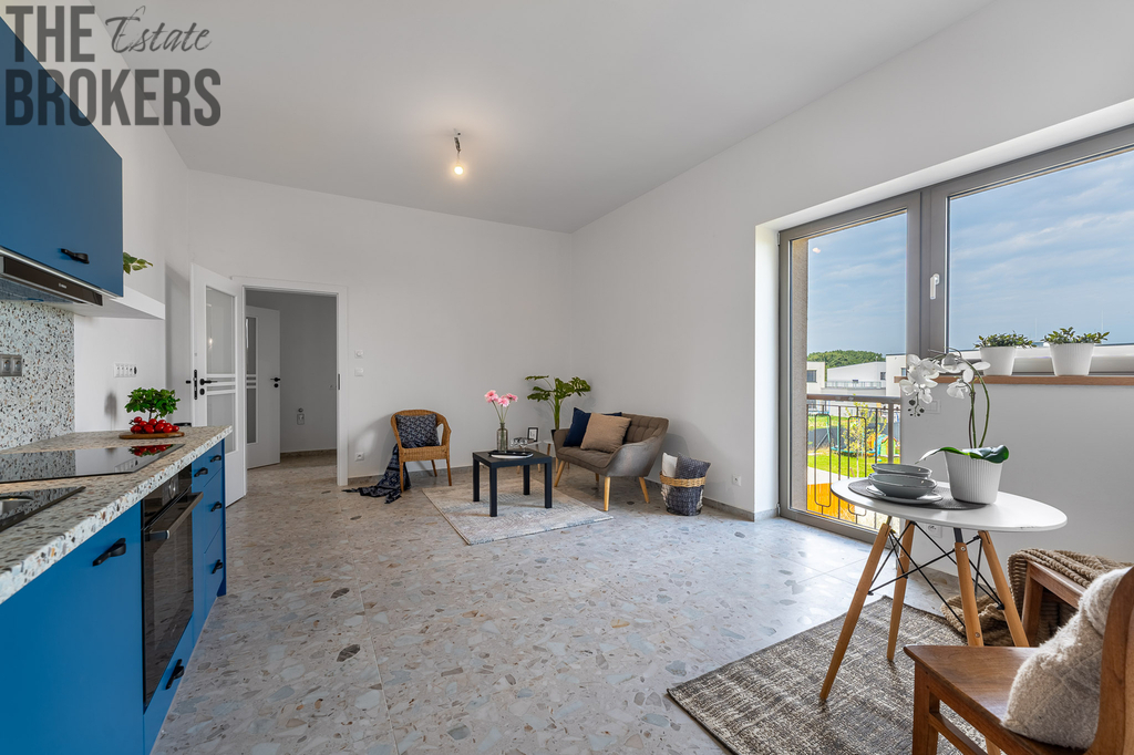 • Prostorný obývací pokoj s designovou kuchyní (spotřebiče BOSCH), jídelním koutem a vstupem na útulný balkon