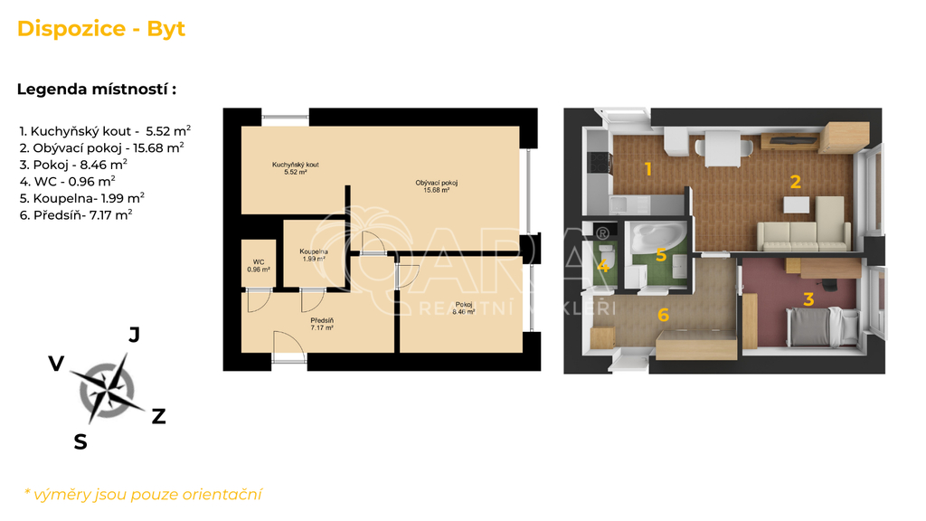 Díky jihozápadní orientaci je byt příjemně prosvětlený po celý den. Praktické dispoziční řešení nabízí dostatek úložného prostoru.