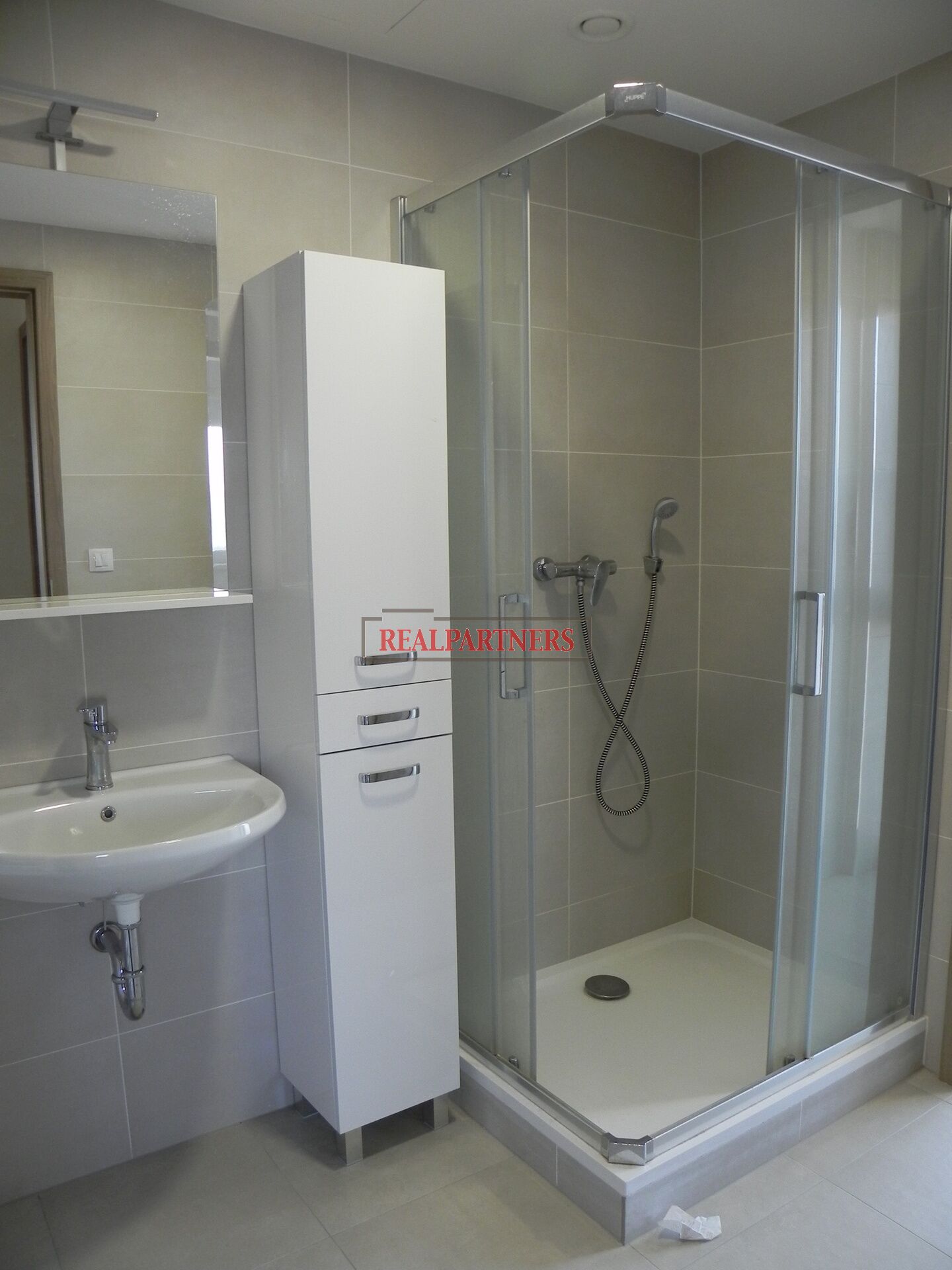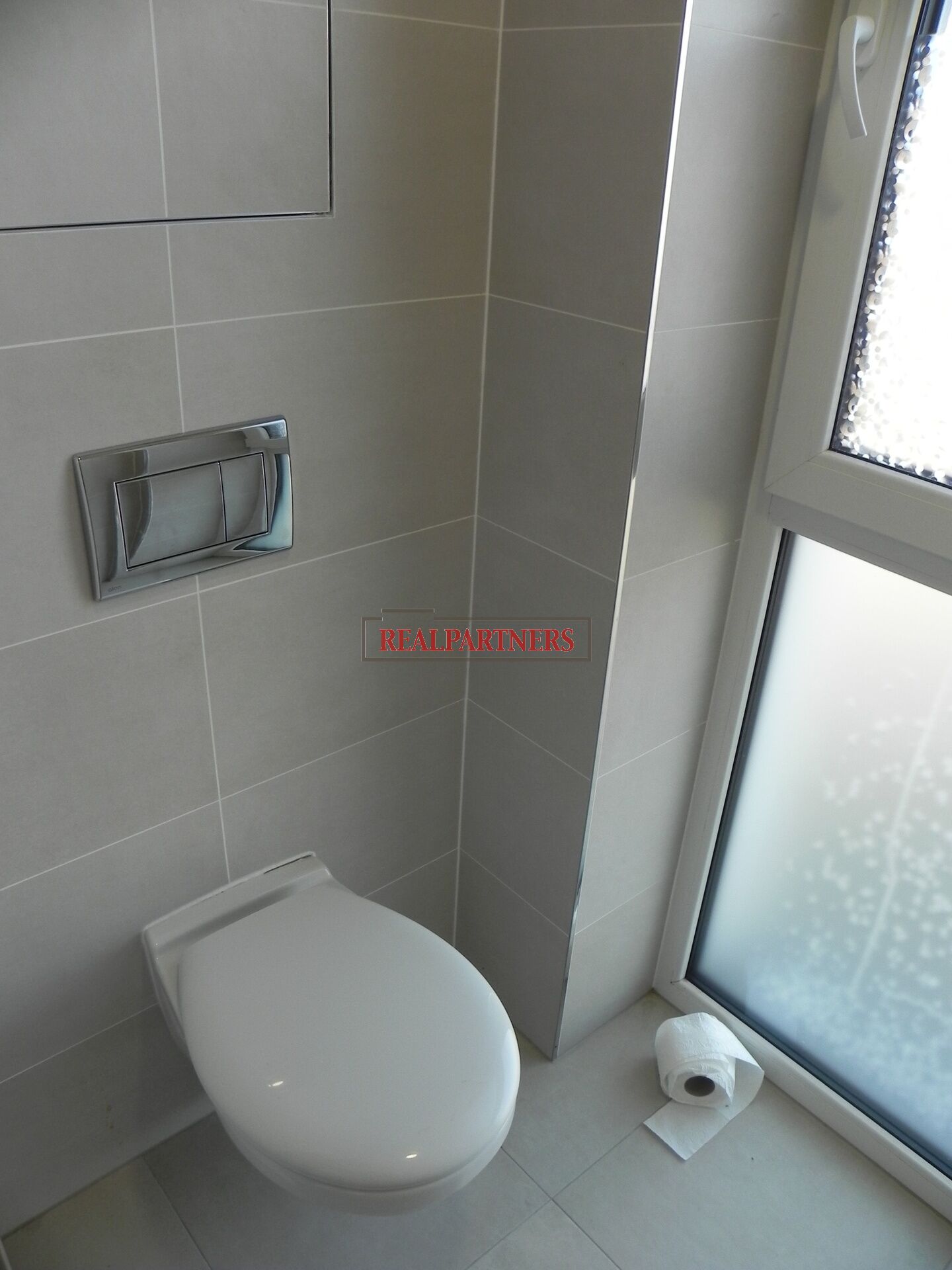 Moderní koupelna s sprchovým koutem, v koupelně je okno, toaleta oddělena zdi.