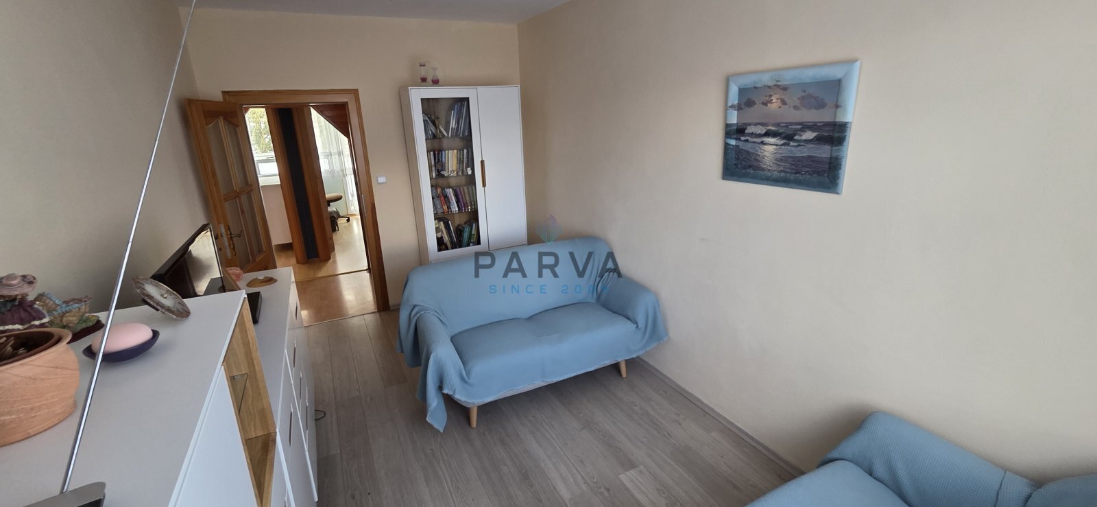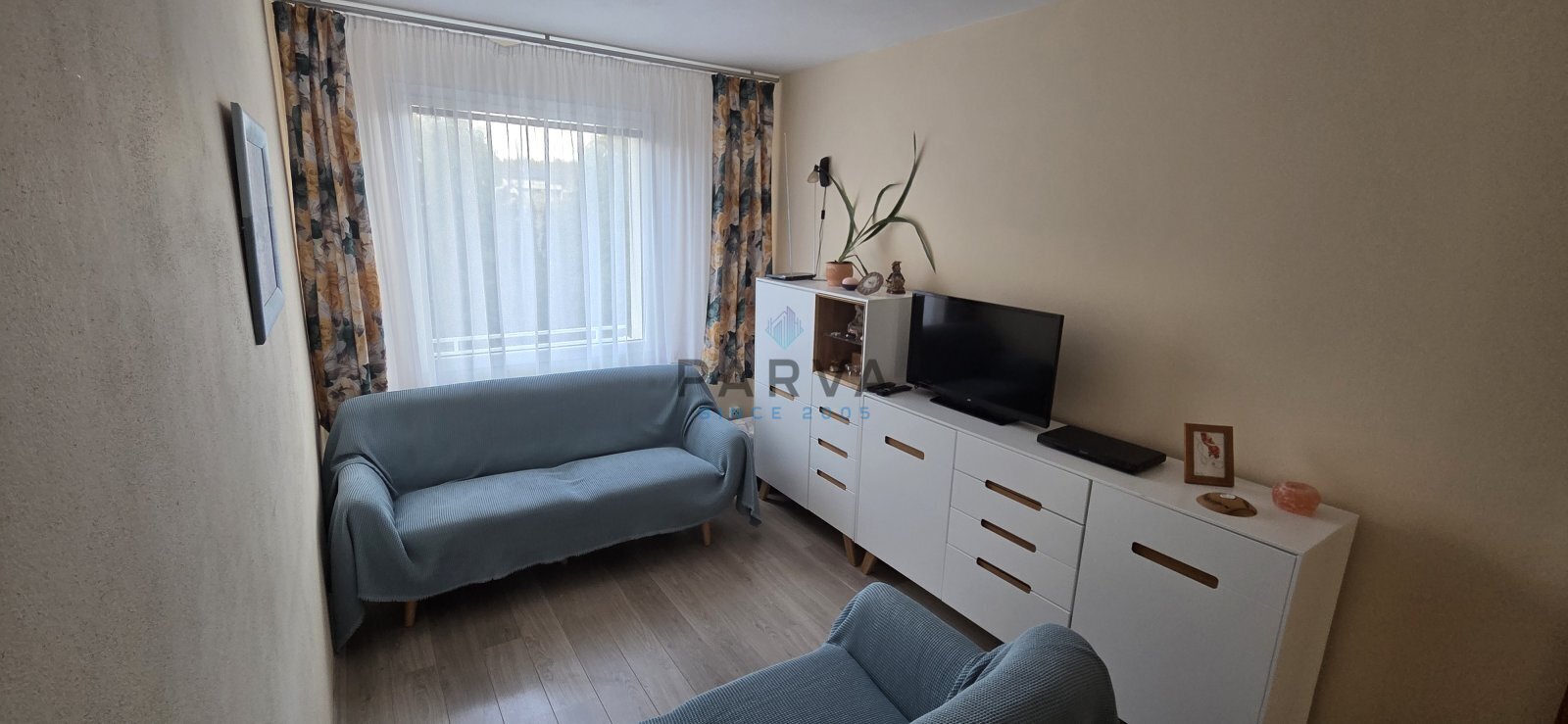 Dispozice je praktická – dva menší dětské pokoje, samostatná ložnice s postelí a vkusnými bílými skříněmi, které poskytují dostatek úložného prostoru, a obývací pokoj se sedací soupravou pro společné chvíle. Byt je zařízený tak, abyste se mohli rovnou nastěhovat bez starostí.