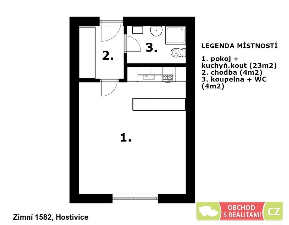 Bytová jednotka o velikosti 31 m² se nachází v 1. patře dvoupatrového bytového domu v klidné části Hostivice, na adrese Zimní 1582, Hostivice.