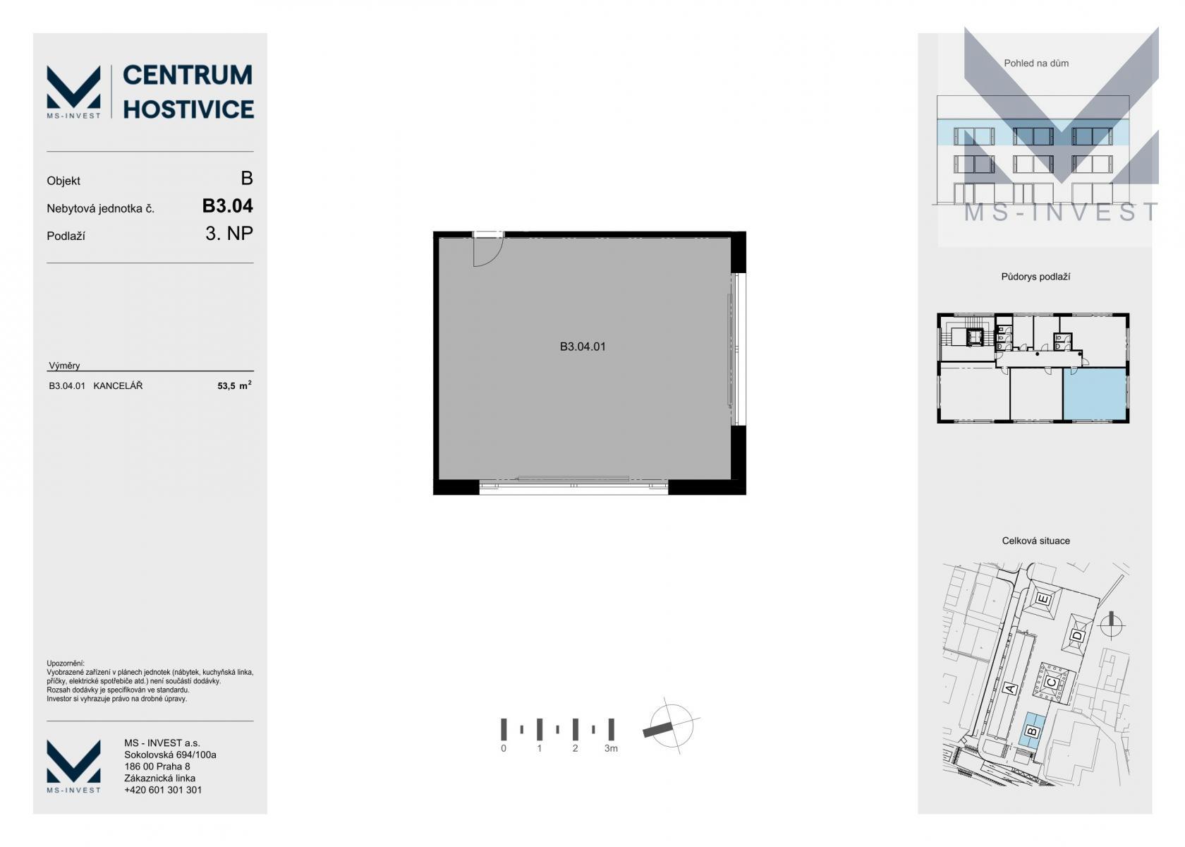 Nabízíme komerční jednotku o ploše 53 m2 ve 3. NP (č. B 304 ) v novostavbě projektu Centrum Hostivice s výtahem. Možné využití: kancelář, obchod, ordinace, apod. Prostor je rohový, velká okna zajištují maximální přísun přirozeného světla, proti slunci jsou naistalovány hliníkové předokenní žaluzie, ve standardu je dále příprava na klimatizaci, podlahové vytápění a další. Jednotky v posledním 3. NP mají vysoké stropy (3,8 m) které umožnuji si pohrát s interiérem a ještě lépe využít nabízený prostor. Objekt B je situován v samém centru Hostivice, s výhledem na Husovo náměstí, zámek a Kostel Sv. Jakuba, u autobusové zastávky a dále u hlavního vstupu do projektu, je tedy velmi vhodný pro komerční využití. Nebytové prostory budou dokončeny ve stavu shell and core, jako tzv. rozestavěná jednotka. Kolaudaci si potom klient řeší sám dle jeho konkrétního způsobu využití komerčního prostoru. Dokončení výstavby je plánované na podzim roku 2025