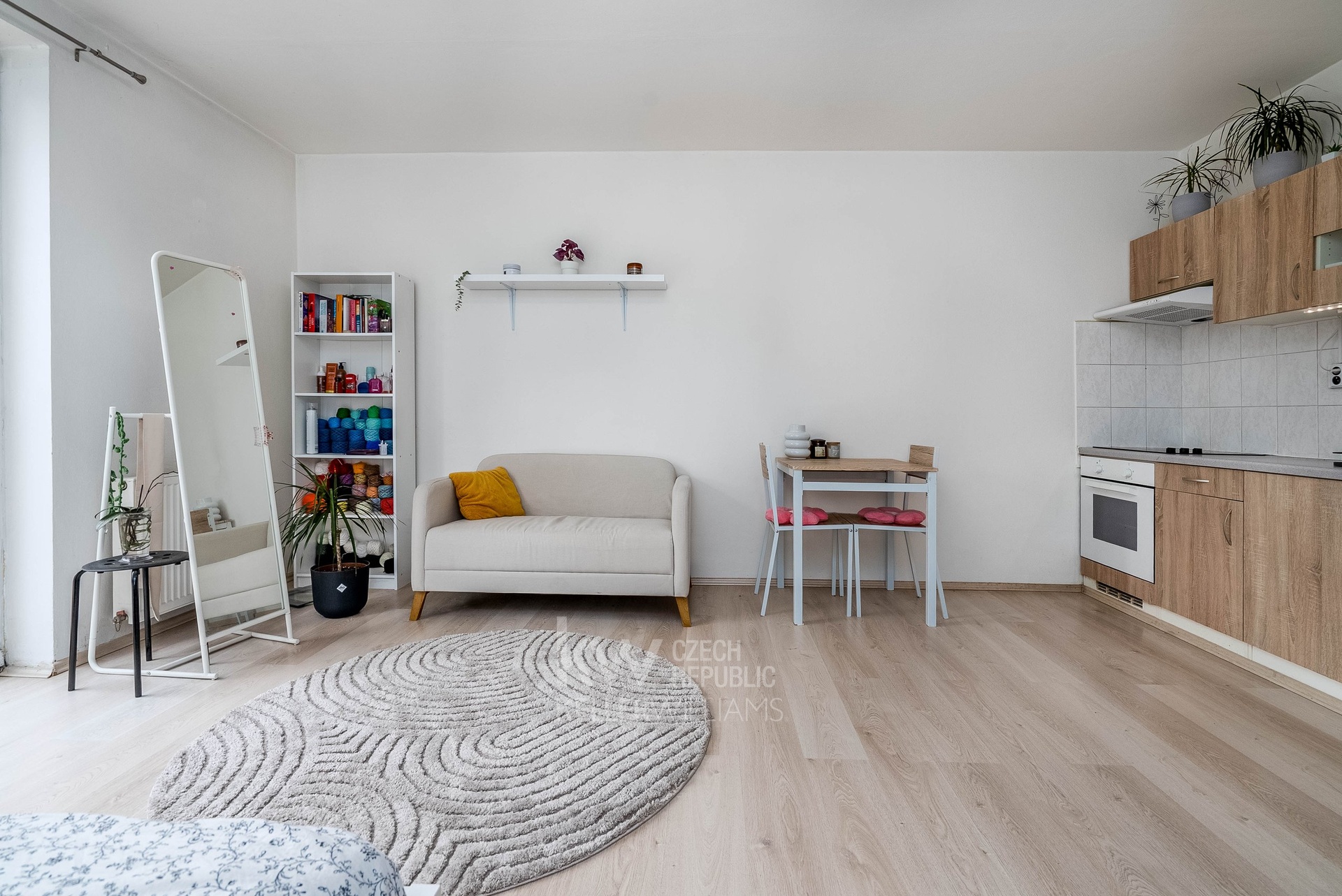 Dominantou bytu je obytný prostor s kuchyňským koutem a přímým vstupem na vlastní zahradu, orientovanou na západní stranu. Právě venkovní prostor dodává bytu příjemný rozměr navíc – ať už pro posezení po práci, ranní kávu, pěstování bylinek nebo jednoduché každodenní užívání bez kompromisů.