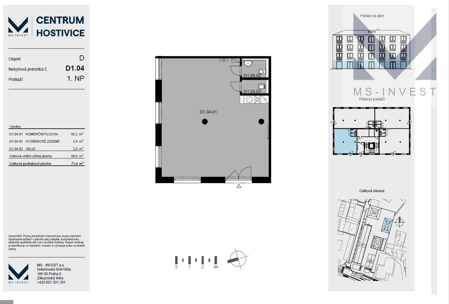 Nabízíme k prodeji komerční prostor s jedním parkovacím stáním s výměrou 71 m2 v přízemí novostavby moderní multifunkční budovy v centru Hostivic. Jednotka D 104 je umístěna v 1. NP (přízemí) budovy D s přímým vstupem z nově vzniklého prostoru mezi budovami, který zároveň bude sloužit jako průchozí místo mezi ulicí Čsl. Armády, ul Cihlářskou a vlakovým nádražím. Prostor je vhodný jako obchod, kanceláře, ordinace apod. Budoucí uživatel si jednotku kolauduje sám podle jím vybraného účelu, prostory se prodávají ve stavu shell and core, jako rozestavěná jednotka. Možnost koupě parkovacích stání před jednotkou. Prodej přímo od developera. Cena je uvedena včetně DPH s jednoho venkovního parkovacího stání.