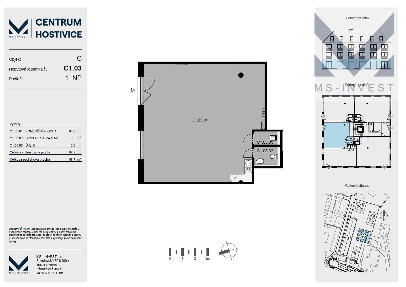 Nabízíme k prodeji komerční prostor s jedním parkovacím stání přímo u budovy . Jednotka C 103 s výměrou 89 m2 v přízemí novostavby moderní multifunkční budovy v centru Hostivice. Jednotka je umístěna v 1. NP (přízemí) budovy C s přímým vstupem z nově vzniklého prostoru mezi budovami, který zároveň bude sloužit jako průchozí místo mezi ulicí Čsl. Armády, ul Cihlářskou a vlakovým nádražím. Prostor je vhodný jako obchod, kanceláře, ordinace apod. Možné propojení s dalšími jednotkami v přízemí budovy až do velikosti 420m2 . Budoucí uživatel si jednotku kolauduje sám podle jím vybraného účelu, prostory se prodávají ve stavu shell and core, jako rozestavěná jednotka. Prodej přímo od developera. Cena je uvedena včetně DPH a parkovacího stání u budovy.