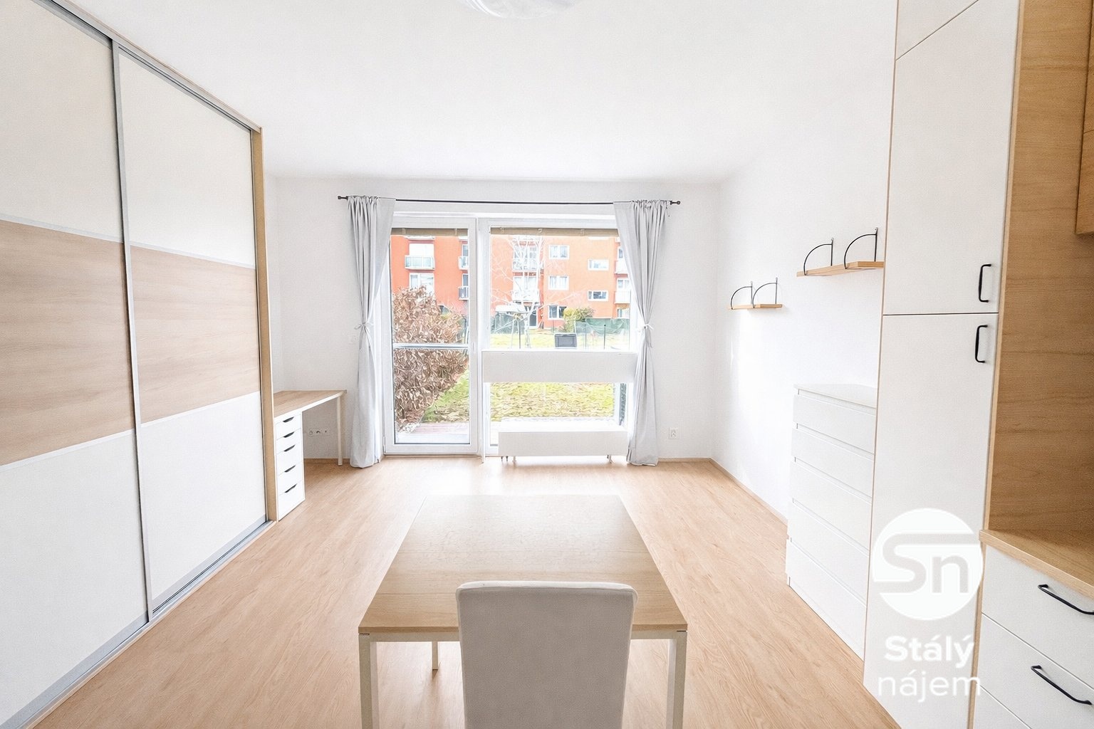 V bytě je k dispozici velká vestavěná skříň a prostorná kuchyňská linka vybavená spotřebiči (bez myčky). Z hlavního, velkého a světlého pokoje je přímý vstup na zahradu o velikosti 48 m².