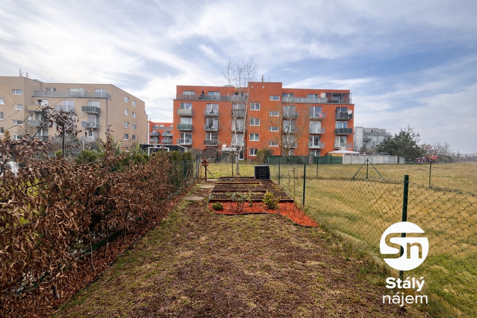 U vstupu na zahradu se nachází praktický zahradní box. Podél plotu jsou vysazeny ovocné keře a habry, které vytvářejí příjemné soukromí. V zadní části zahrady jsou vyvýšené záhony, ideální pro pěstování vlastní zeleniny nebo bylinek.