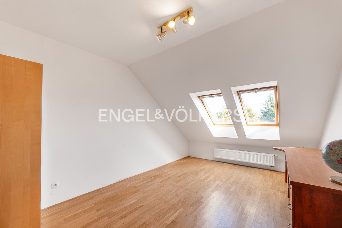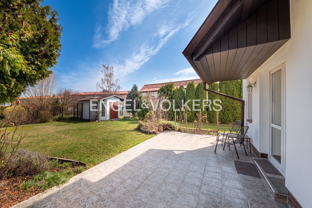 Dům je obklopen zahradou o výměře 482 m². Součástí pozemku je praktický zahradní domek pro sezónní vybavení a dvě vyhrazená parkovací stání přímo u objektu. Srdcem celého domu je v přízemí situovaný prostorný obývací pokoj s dřevěnými parketami. Díky velkým oknům orientovaným na dvě světové strany je pokoj prosvětlený a skrze dvoukřídlé dveře umožňuje vstup na zahradu. Na obývací pokoj navazuje jídelna vybavená stolem a židlemi, na kterou navazuje kuchyně vybavená lednicí, sporákem a myčkou na nádobí. Praktičnost přízemí doplňuje první ze dvou koupelen se sprchovým koutem. Druhé patro nabízí tři samostatné a neprůchozí ložnice zajišťující naprosté soukromí. Jedna z ložnic disponuje vstupem na balkon s příjemným výhledem do okolní zeleně. Horní patro obsahuje velkou rodinnou koupelnu se sprchovým koutem i vanou.