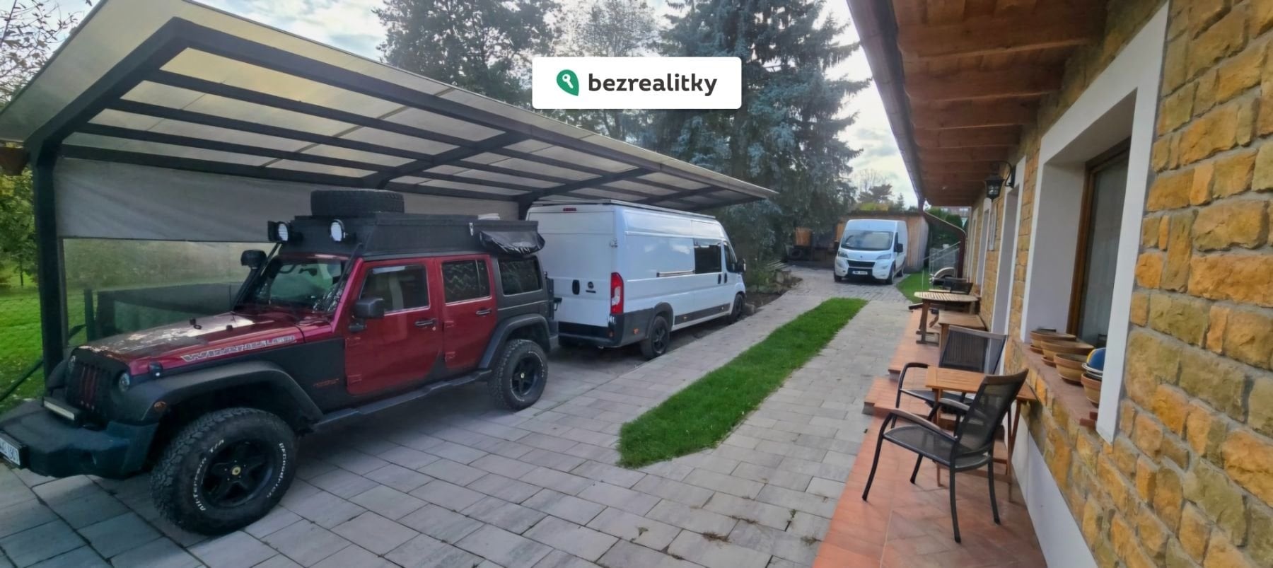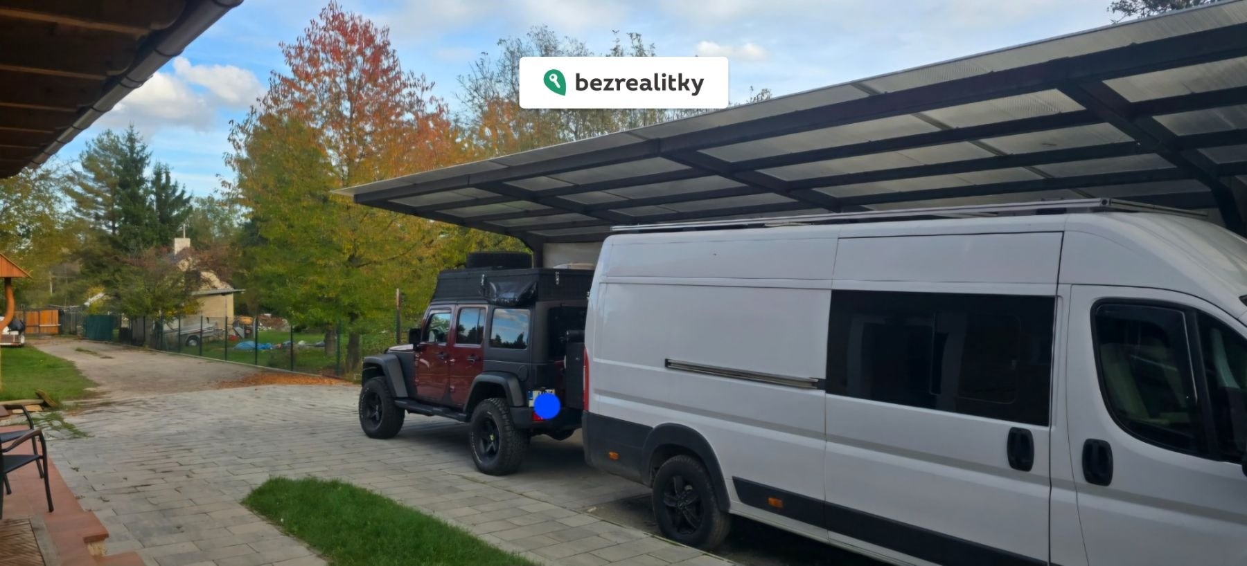 Pozemek o rozloze 1118 m² (včetně příjezdové cesty) nabízí dílnu, přístřešek pro dvě auta a celkově možnost parkování až šesti vozidel.