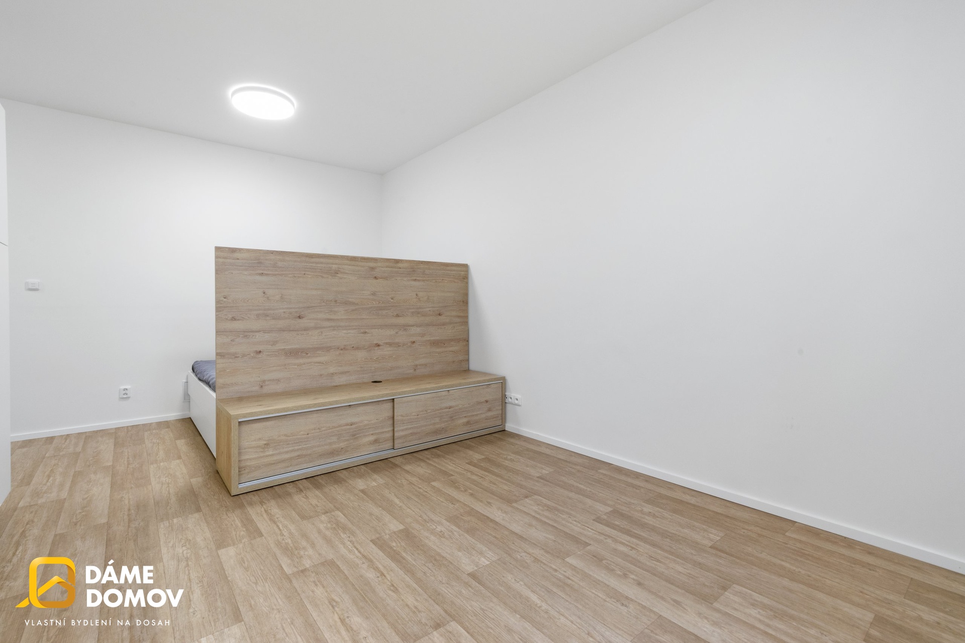 * Hlavní pokoj: kuchyňská linka, vestavěná varná deska, vestavěná multifunkční mikrovlnná trouba, vestavěná myčka, vestavěná lednice s mrazákem, digestoř. TV stolek oddělující prostor na spaní, dvojlůžko s úložným prostorem.