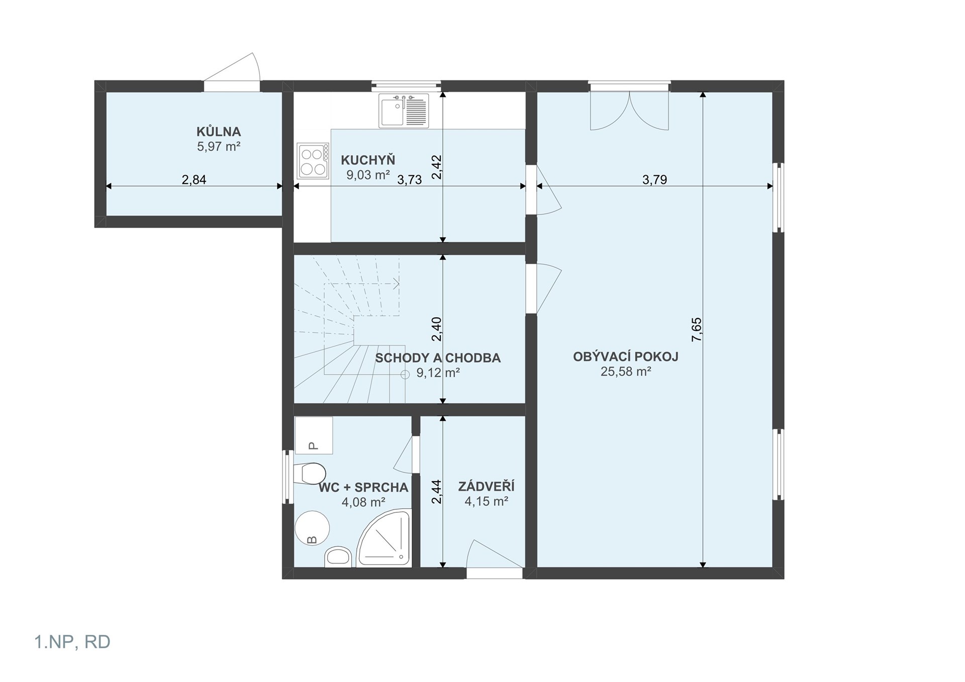 V přízemí se nachází vstupní zádveří, koupelna se sprchovým koutem, WC a technickým zázemím pro kotel. Dále chodba s dřevěným schodištěm ve tvaru „U“, samostatná kuchyň a prostorný obývací pokoj s jídelnou a vstupem na slunnou terasu.