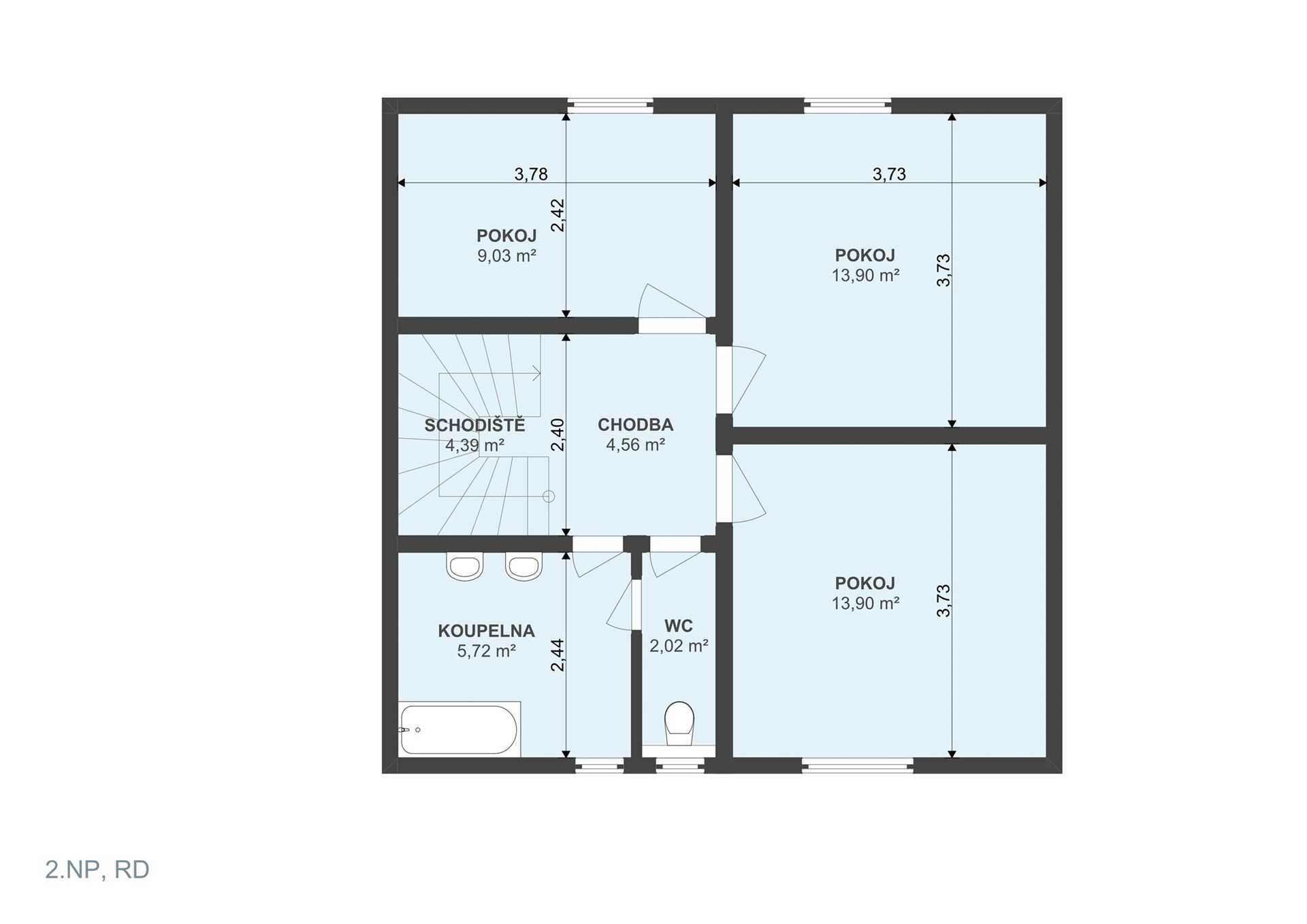 První patro nabízí klidovou zónu s chodbou a přístupem do půdního prostoru. Najdete zde tři samostatné pokoje, prostornou koupelnu s vanou a samostatné WC.