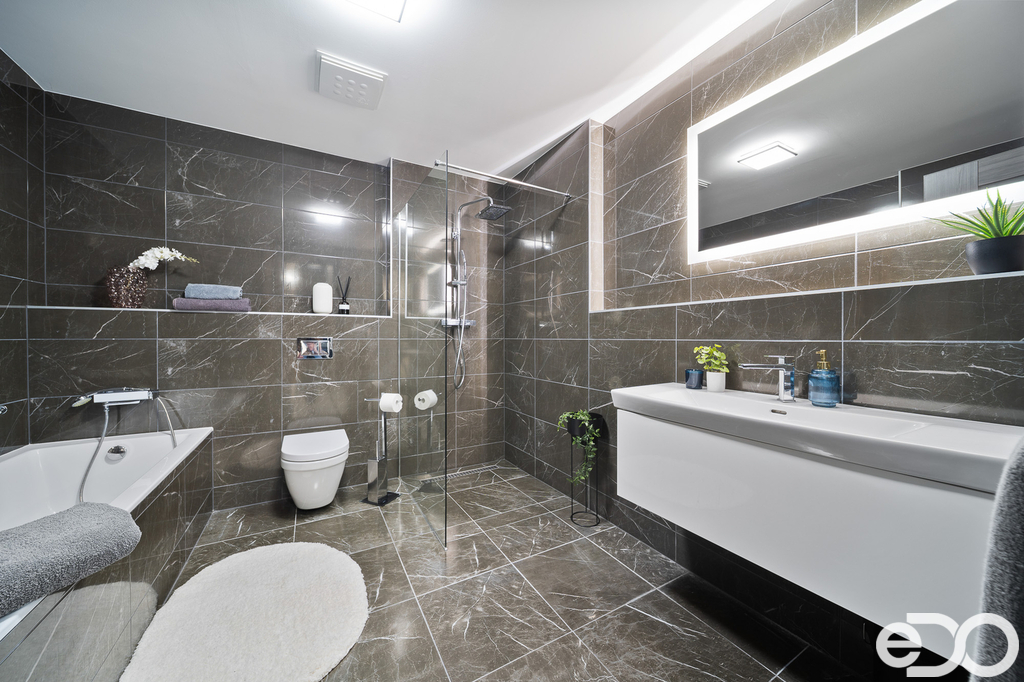 • luxusní koupelna s vanou i designovou sprchovou skleněnou stěnou