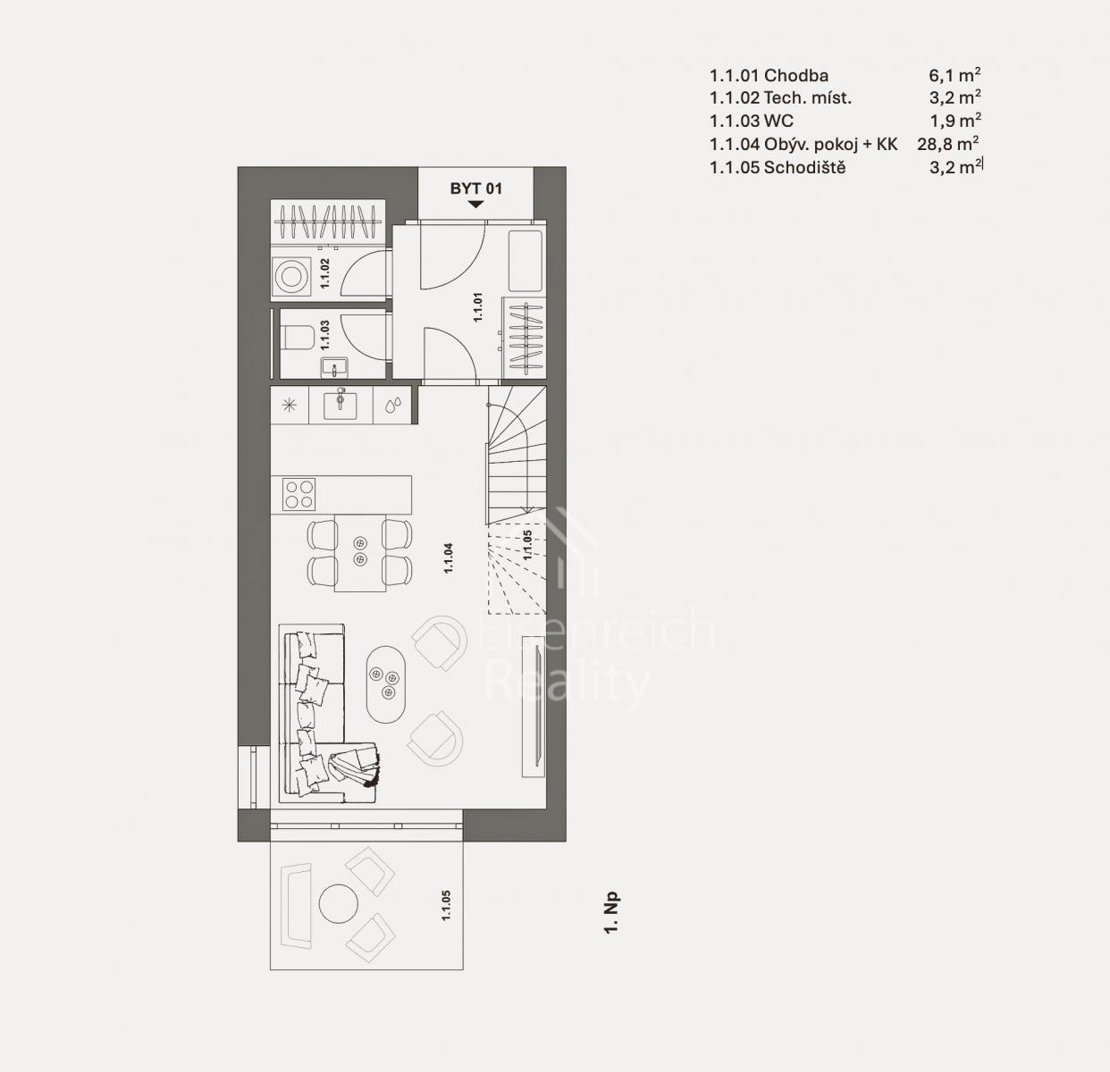 Byt o celkové ploše 84 m and sup2; disponuje prostornou zahradou o velikosti 51 m and sup2;, která poskytuje ideální zázemí pro relaxaci i rodinné aktivity.