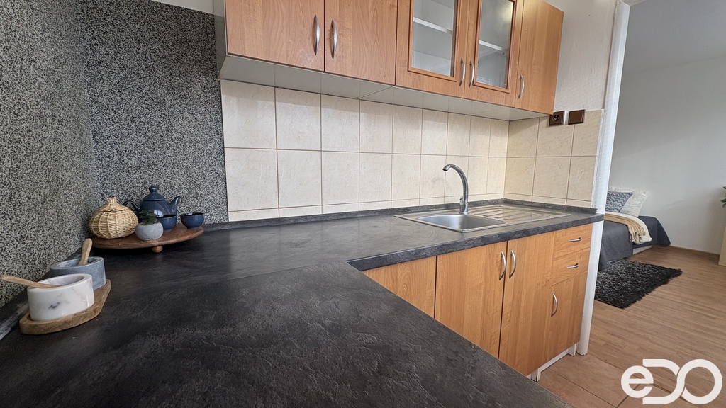 Dispozice bytu nabízí obytný pokoj, samostatnou kuchyni s kuchyňskou linkou a koupelnu se sprchovým koutem. Byt nemá balkon, ale díky umístění ve vyšším patře je příjemně světlý. Součástí bytu je také sklepní kóje o velikosti 2 m², která poskytuje praktický úložný prostor.