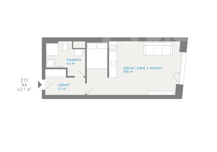 Velikost bytu je 42,1 m2, byt je orientovaný na jih a nachází se ve 3.nadzemním podlaží.
