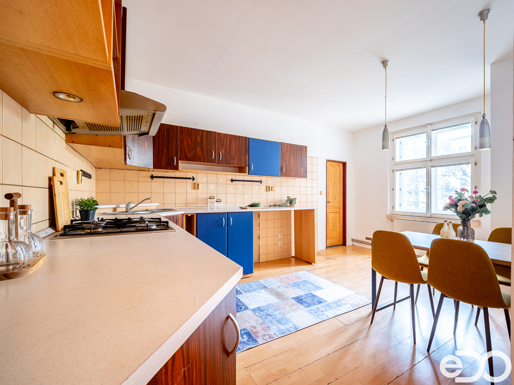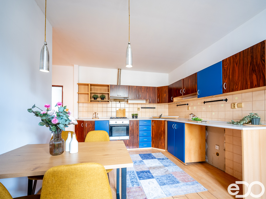 Díky celkové výměře byt poskytuje nadstandardní prostor v rámci dispozice 2+1. Kuchyně je samostatná a navazuje na centrální chodbu, která propojuje jednotlivé části bytu.