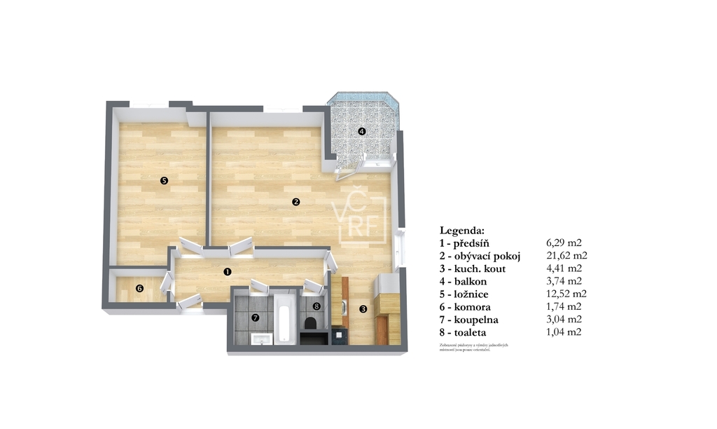 Po vstupu do bytu se ocitnete v centrální chodbě, ze které máte přístup do všech místností samostatně. Vlevo komora a ložnice a vpravo obývací pokoj s balkónem, kuchyňský kout s přípravou pro kuchyňskou linku, koupelna a samostatné WC. K bytové jednotce náleží praktická skladovací komora, která je umístěna na stejném patře, jako byt.