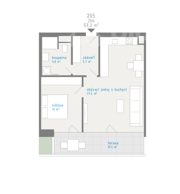 Velikost bytu je 53,3 m2, k bytu náleží terasa o velikosti 10,5m2, byt je orientovaný na jihozápad a nachází se ve 2.nadzemním podlaží.