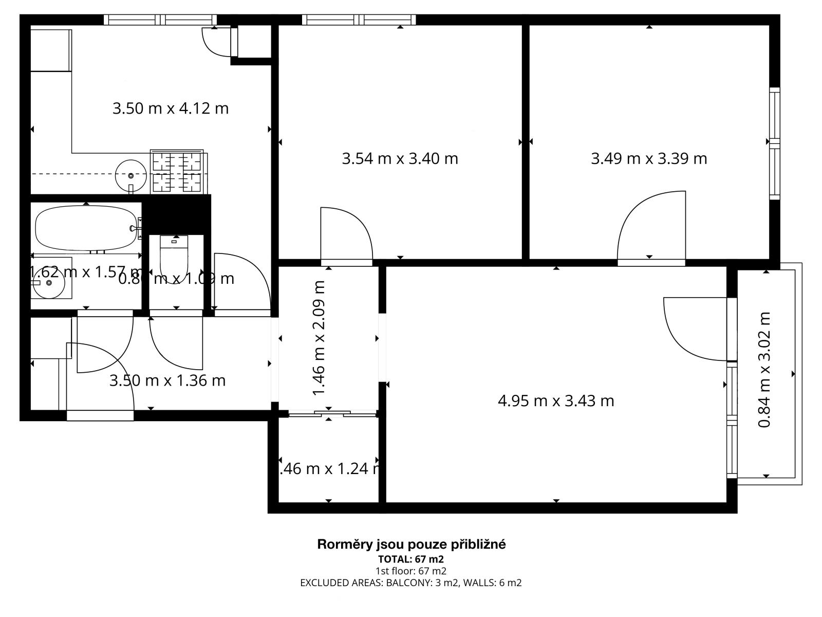 Dispozice bytu zahrnuje tři samostatné pokoje, kuchyň, koupelnu a toaletu. K bytu náleží lodžie, která je přístupna z obývacího pokoje a poskytuje příjemné místo k odpočinku.