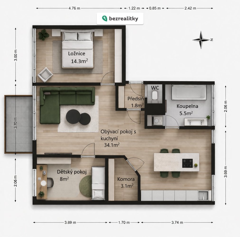 Dominantou je velkorysý obytný prostor s kuchyňským koutem a ostrůvkem, který přirozeně propojuje vaření, stolování i odpočinek. Celý prostor je příjemně prosvětlený a navazuje na rozšířený balkon.