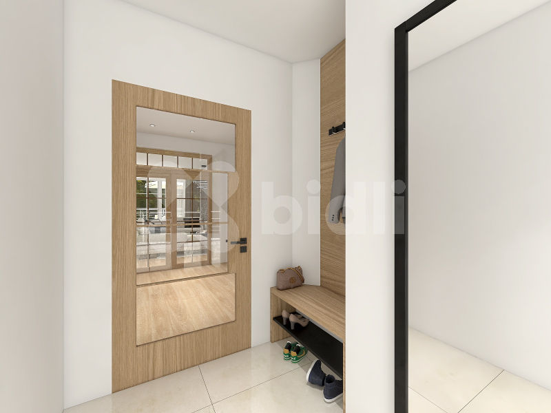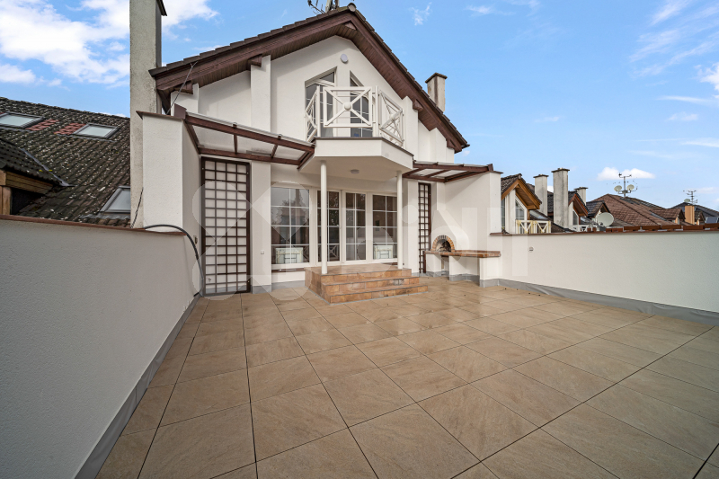 V 1. patře je užitná plocha cca 147 m2 z toho cca 58 m2 má zahradní terasa, kde jsou umístěna krbová kamna vhodná na letní grilování. Dále je vstupní chodba, WC a technická místnost, kuchyň, obývací pokoj s jídelnou a schodiště.