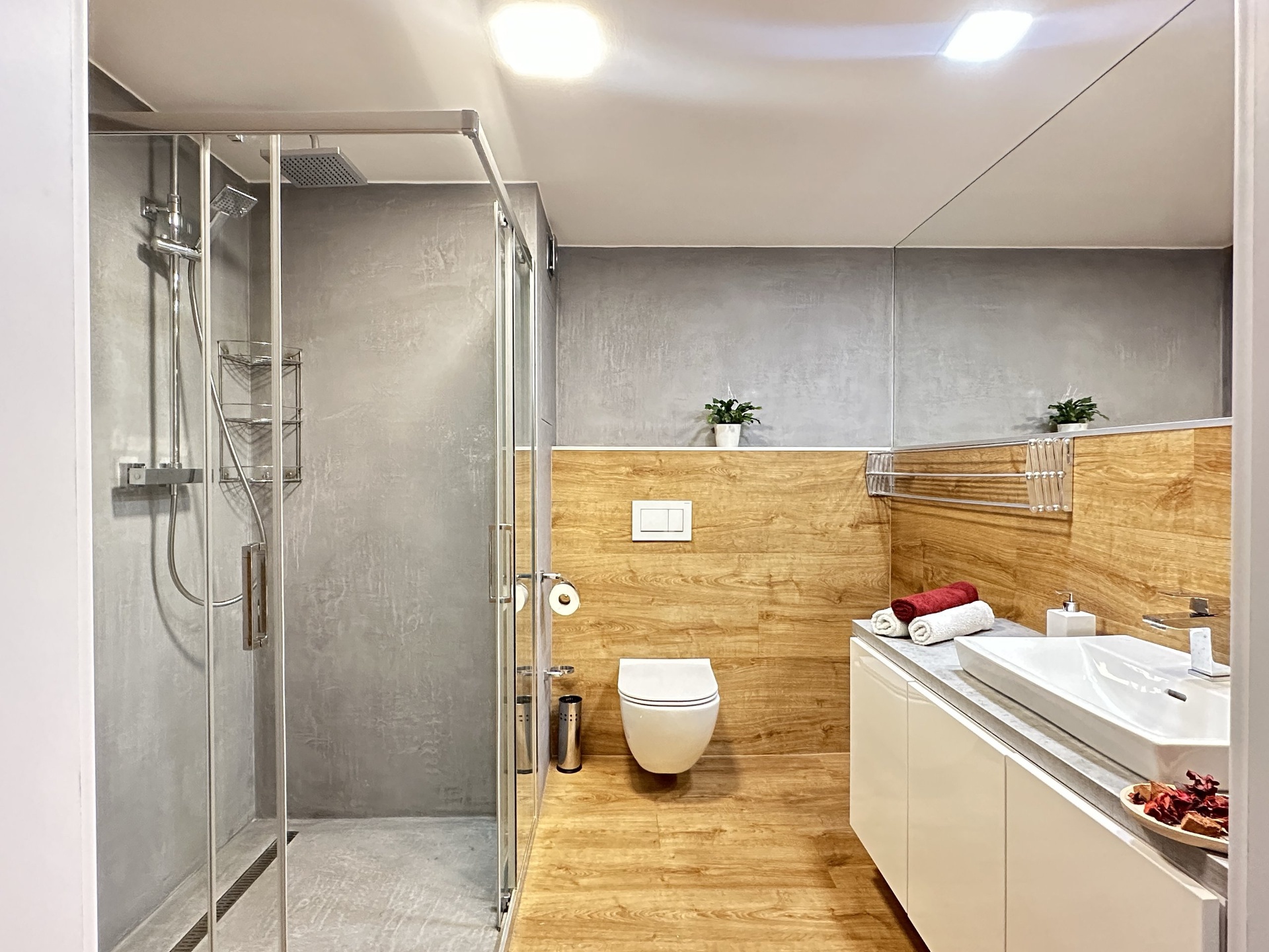 Na tomto ateliéru oceníte především to, že jde o moderní byt, který disponuje prostornou koupelnou s moderními obklady, topným žebříkem a kvalitním zařízením – použity byly například vodovodní baterie značky GROHE s úspornými šetřiči vody, toaleta od švýcarské společnosti Geberit a elegantní sprchový kout.