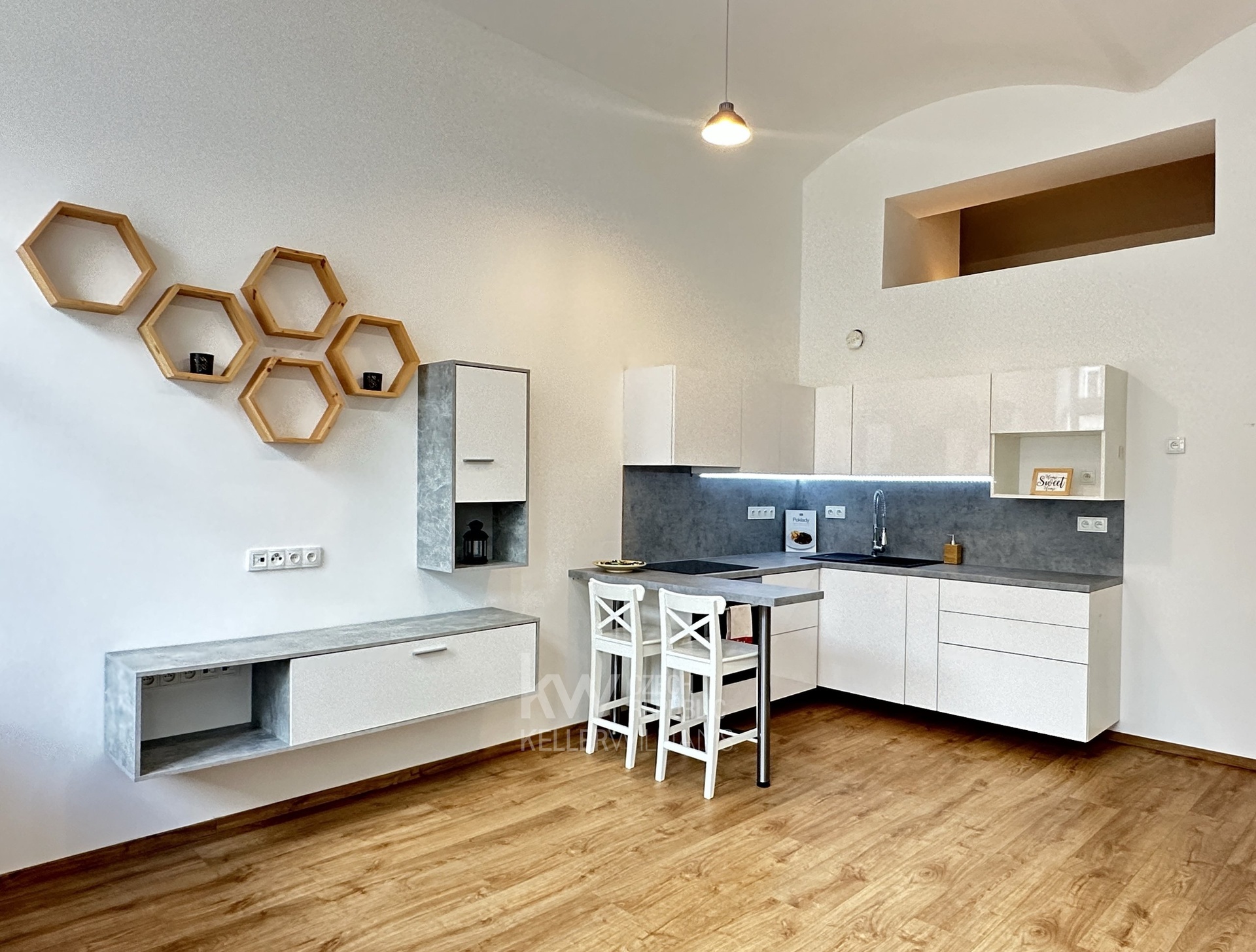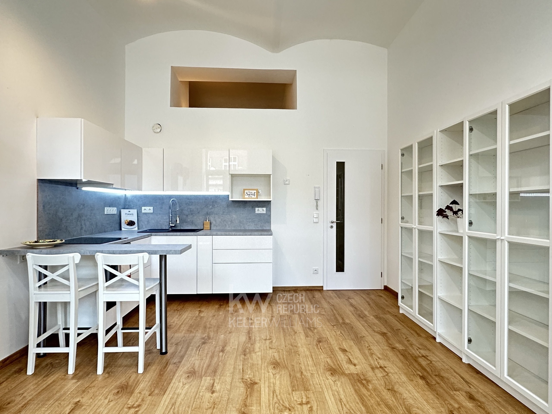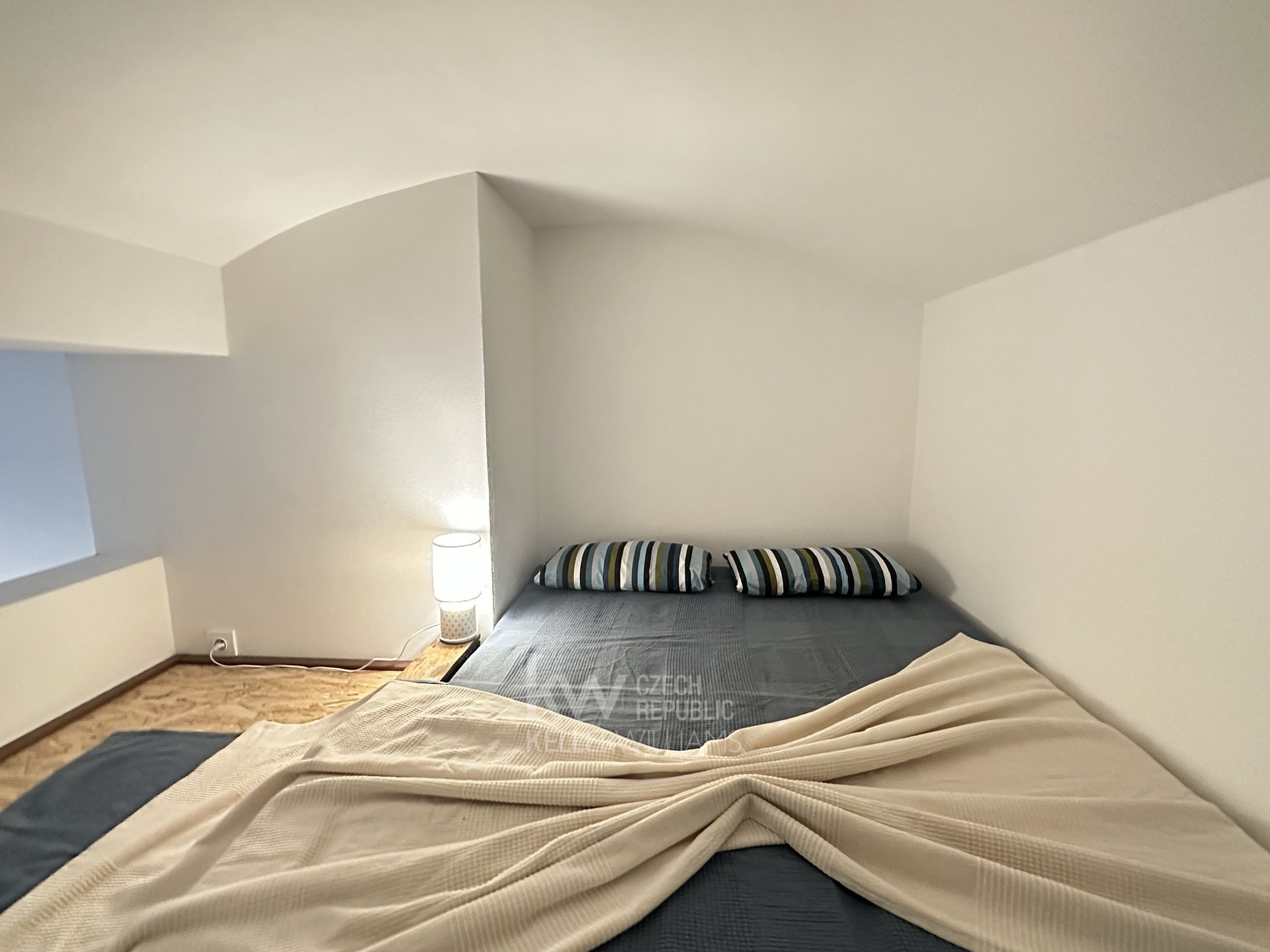 Kuchyňská linka je vybavena varnou deskou, vestavěnou troubou a digestoří. Na chodbě najdete velkou vestavěnou skříň, která nabízí spoustu úložného prostoru. Praktickým bonusem je spací patro o rozloze 5 m2 (není započítáno do celkové plochy). Během několika týdnů se bude realizovat dřevěné schodiště.