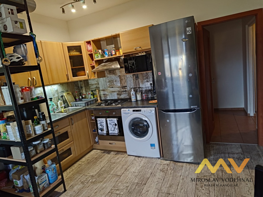 Byt je částečně zařízený a modernizovaný, nabízí praktickou dispozici tvořenou obývacím pokojem s kuchyňským koutem, samostatným pokojem, koupelnou s vanou a toaletou, předsíní a prostornou komorou přímo v bytě. K bytu dále náleží sklepní kóje a společná lodžie umístěná na mezipatře.