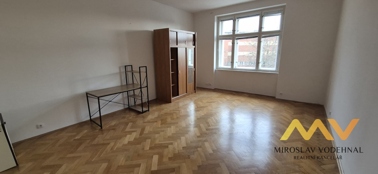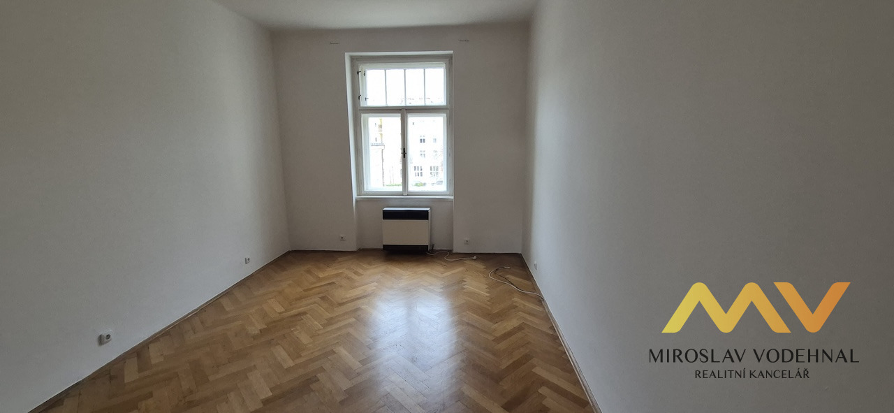 Dispozice bytu tvoří dva samostatné, neprůchozí pokoje o velikosti 19,57 m² a 26,59 m², dále předsíň (4,49 m²) a koupelna se sprchovým koutem a toaletou (4,77 m²). Byt je nezařízený, k dispozici je pouze kuchyňská linka s plynovým sporákem. Podlahy jsou řešeny kombinací parket a dlažby, okna jsou původní dřevěná špaletová. Internetové připojení je možné.
