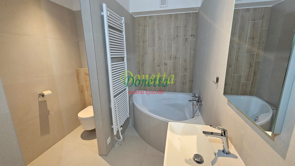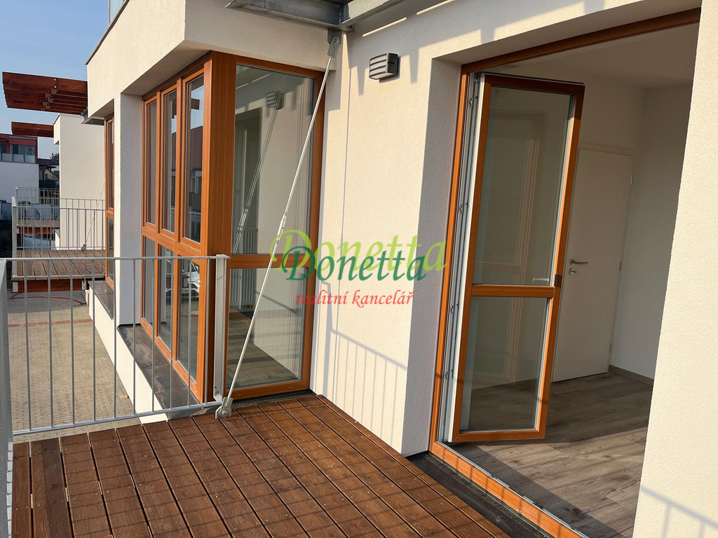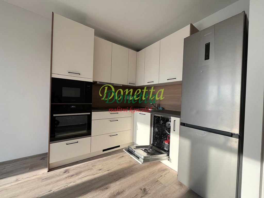 Byt se pronajímá s dispozicemi: velká vstupní chodba, obývací pokoj s kuchyňským koutem, kde se nachází kompletně vybavená kuchyňská linka (mikrovlnná trouba, elektrická trouba, myčka na nádobí, lednice s mrazákem, indukční varná deska, digestoř s nerezovým dřezem a kuchyňskou baterií) a jídelní prostor, ložnice ze které je vstup na balkon a do šatny, koupelna s rohovou vanou, umyvadlem, žebříkovým radiátorem, prostorem pro pračku a s toaletu. K bytu náleží sklep v přízemí domu. Podlahová krytina bytu je dlažba, v pokojích plovoucí podlaha. V celém bytě jsou instalována stropní světla. Veškeré spotřebiče jsou nové a funkční. Byt je zcela nový, uklizený a vymalovaný. Orientace bytu je na východ až jihovýchod.
