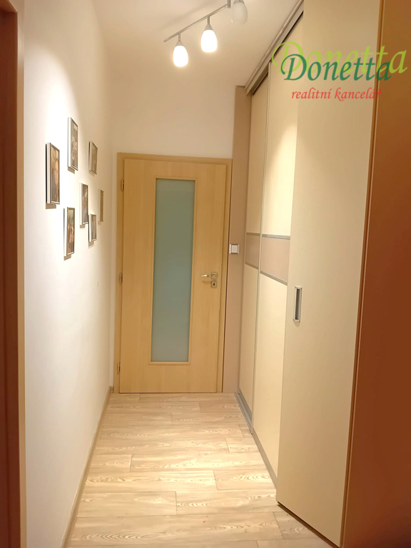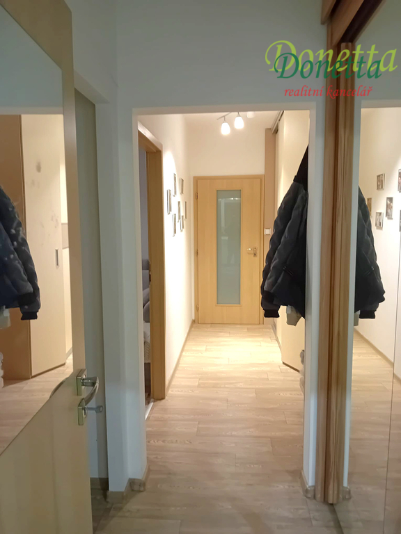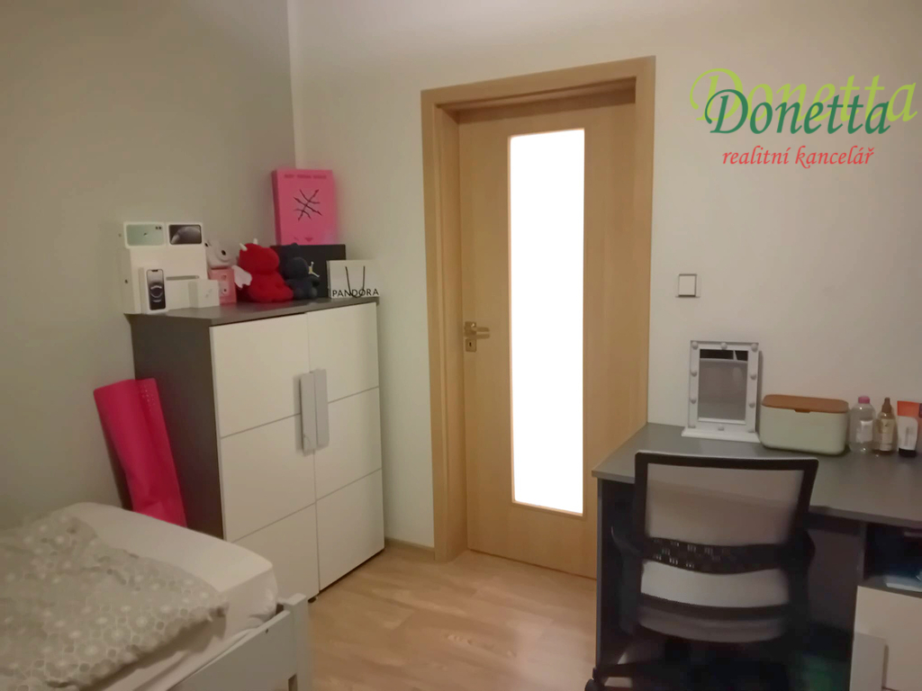 Dispozice: prostorná vstupní chodba, koupelna s vanou, umyvadlem, prostorem pro pračku, samostatná toaleta, kuchyně s jídelní částí, tři pokoje - obývací pokoj, ložnice a dětský pokoj. Pokoje mají podlahy pokryty plovoucí podlahou. K bytu nálěží balkon a komora na patře vedle bytu. Byt je základně vybaven. V kuchyni je k dispozici indukční varná deska, digestoř, dřez, baterie a myčka.