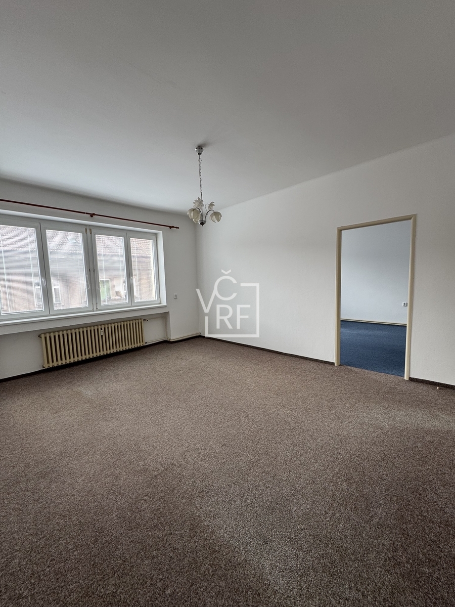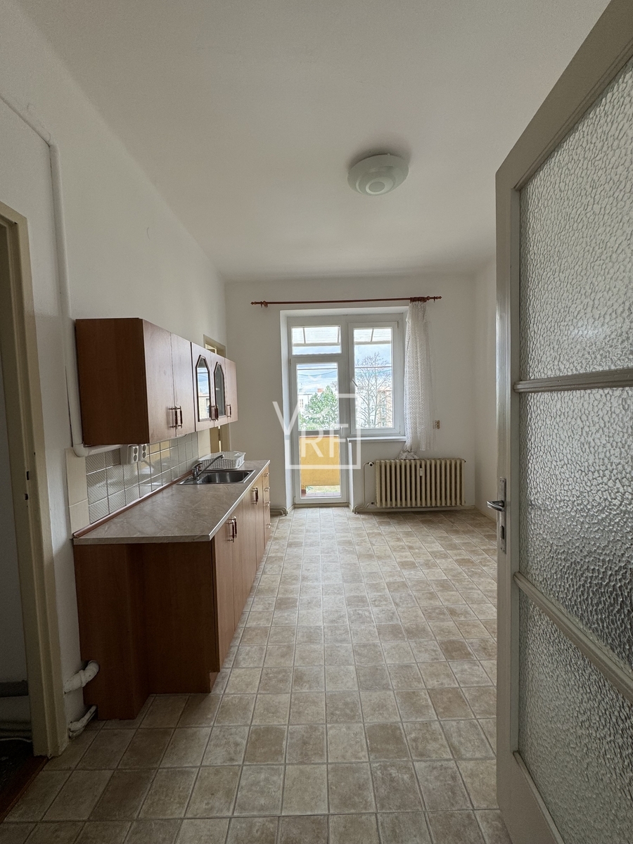 vstupní hala s komorou, dva samostatné, průchozí pokoje se vstupem na balkon 6 m2, dále samostatné WC, koupelna s vanou a obytná kuchyň s balkonem 1,5 m2 do dvora a dvě komory. Byt je nezařízený, k dispozici je pouze kuchyňská linka se sporákem.