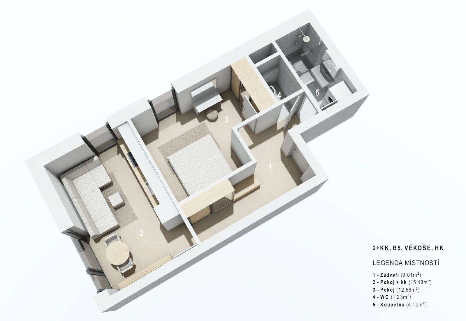 dispozice: vstupní chodba, pokoj s kuchyňským koutem, pokoj, koupelna se sprchou a místem pro pračku a sušičku, samostatné WC