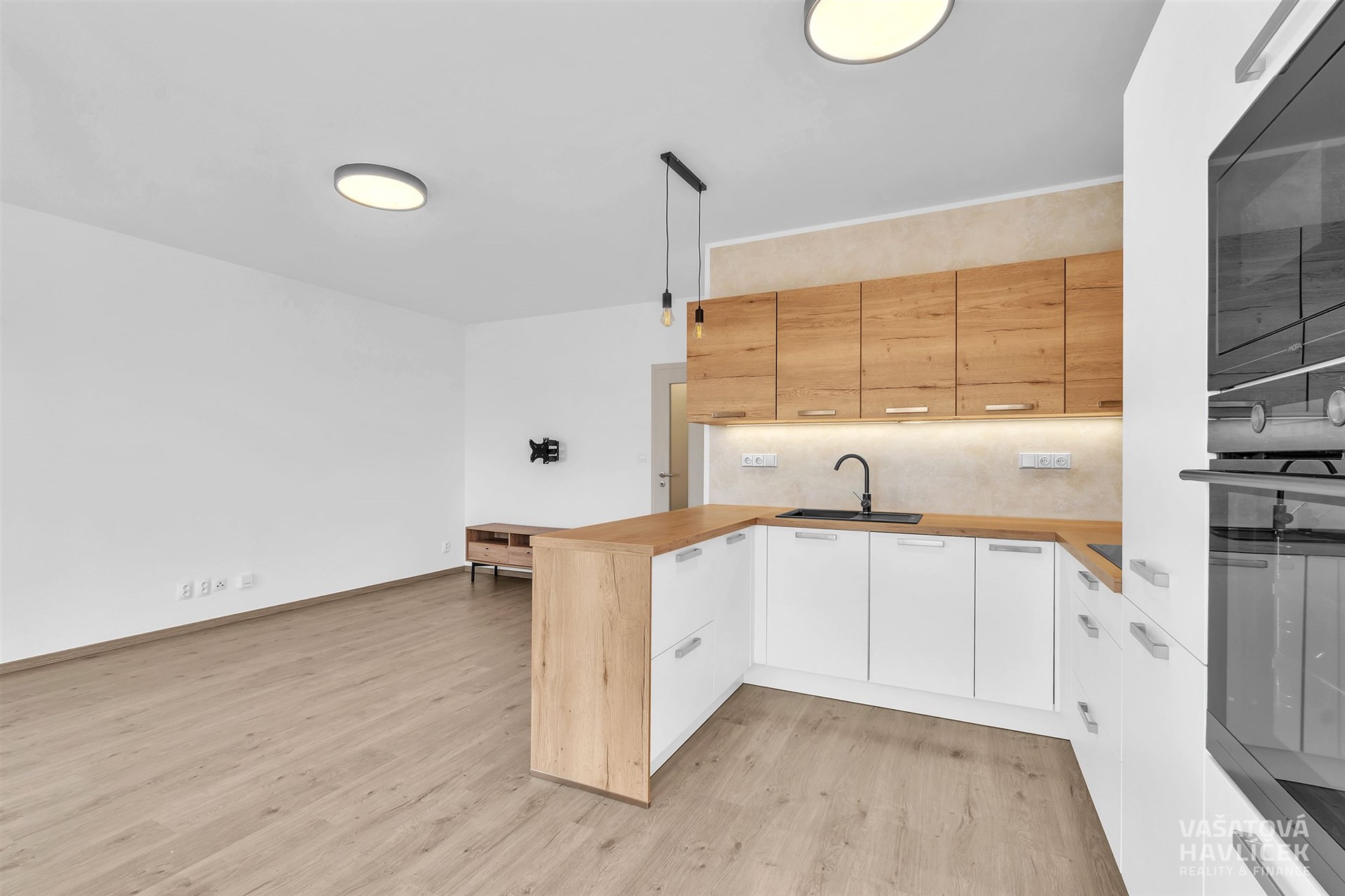 > bílá kuchyňská linka v kombinaci s dřevo dekorem s vestavěnými spotřebiči (elektrická trouba, indukční deska s digestoří, myčka, lednice s mrazákem, mikrovlnná trouba)