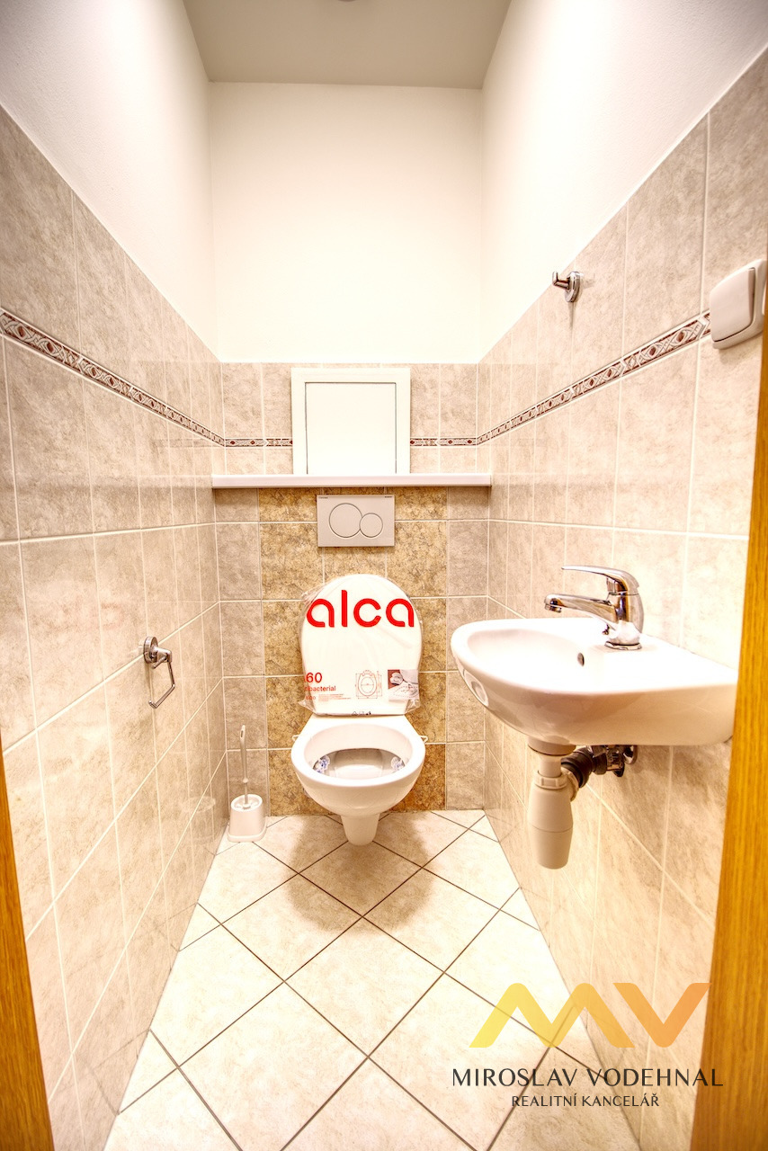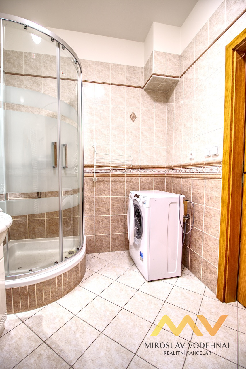 Koupelna je vybavena sprchovým koutem, umyvadlem s koupelnovou skříňkou a zrcadlem, bidetem a pračkou. Samostatné WC s umyvadlem je umístěno vedle koupelny. Vytápění bytu je centrální plynové (vlastní kotel). Byt má plastová okna se žaluziemi a podlahy pokrývá dlažba a laminátová podlaha.