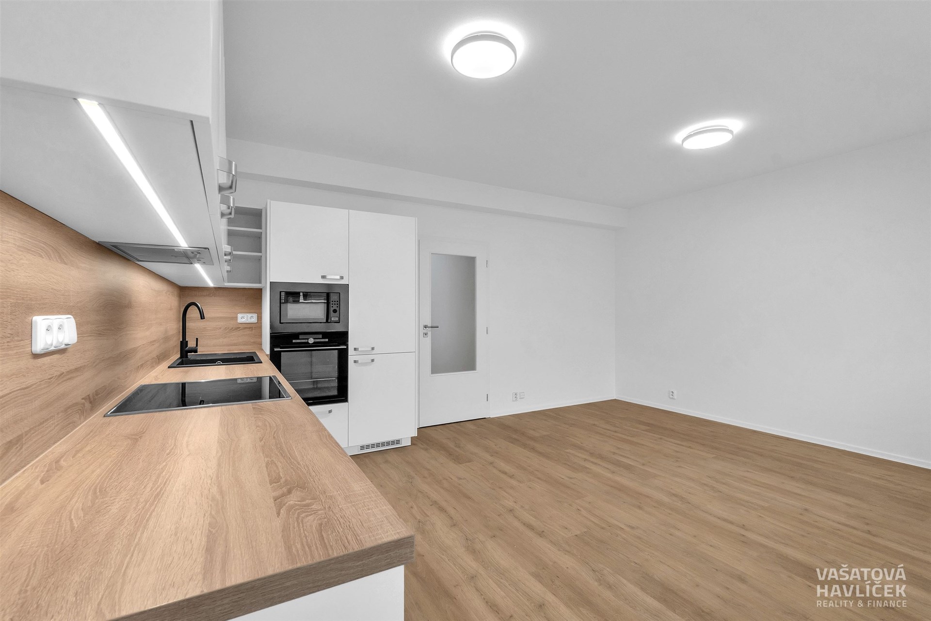 > nová kuchyňská linka s vestavěnými spotřebiči (trouba, indukční deska, myčka, lednice s mrazákem, digestoř, mikrovlnná trouba)