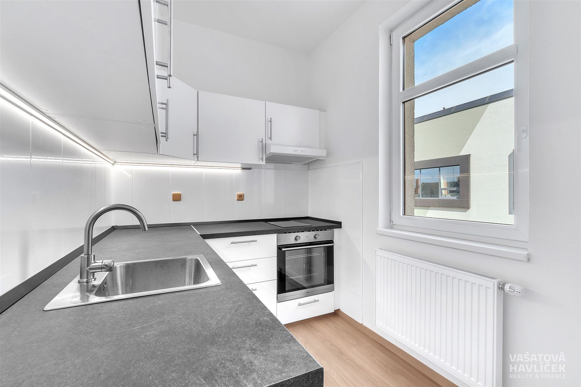 > jednoduchá kuchyňská linka s dřezem, indukční deska (2plotýnka), el. trouba