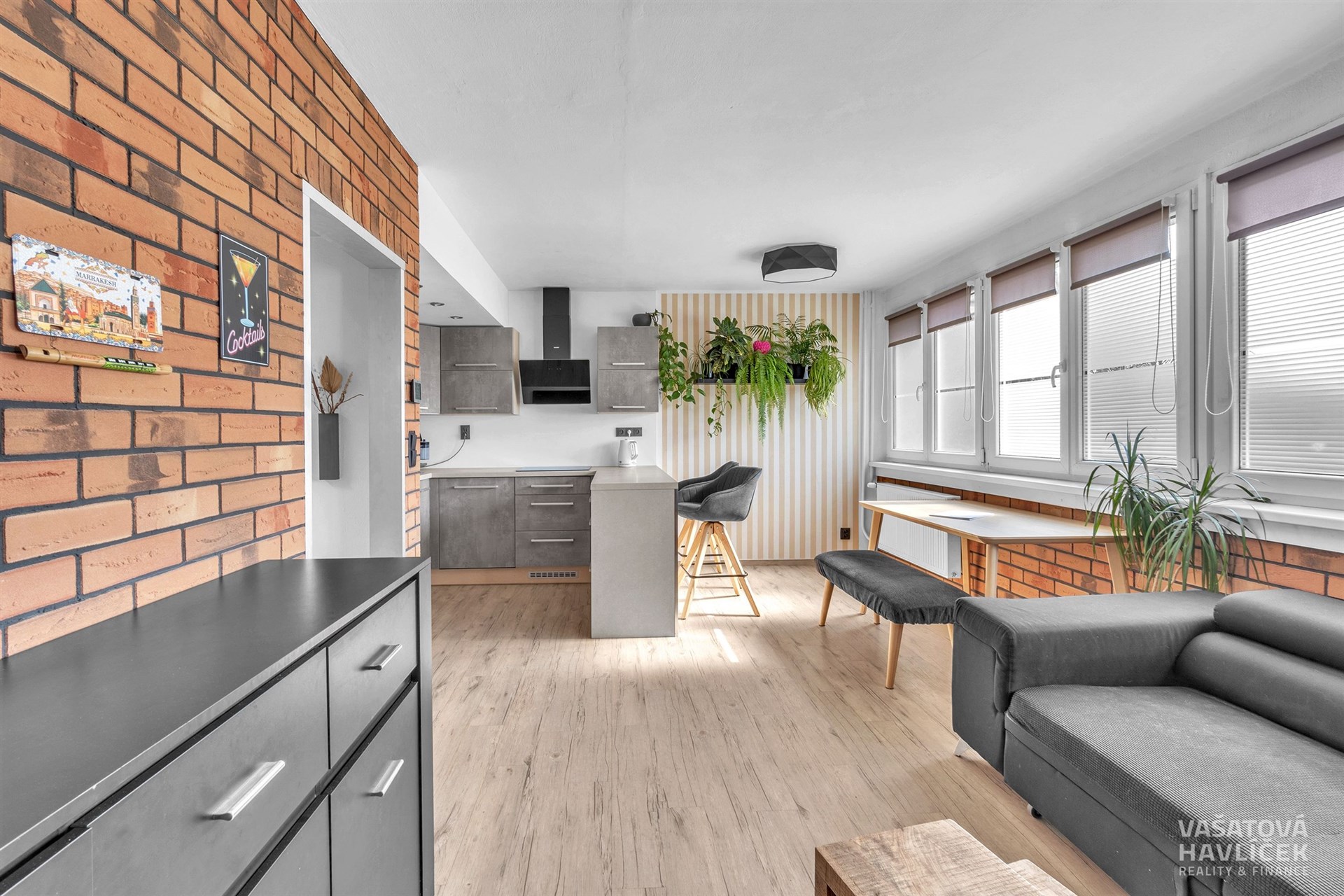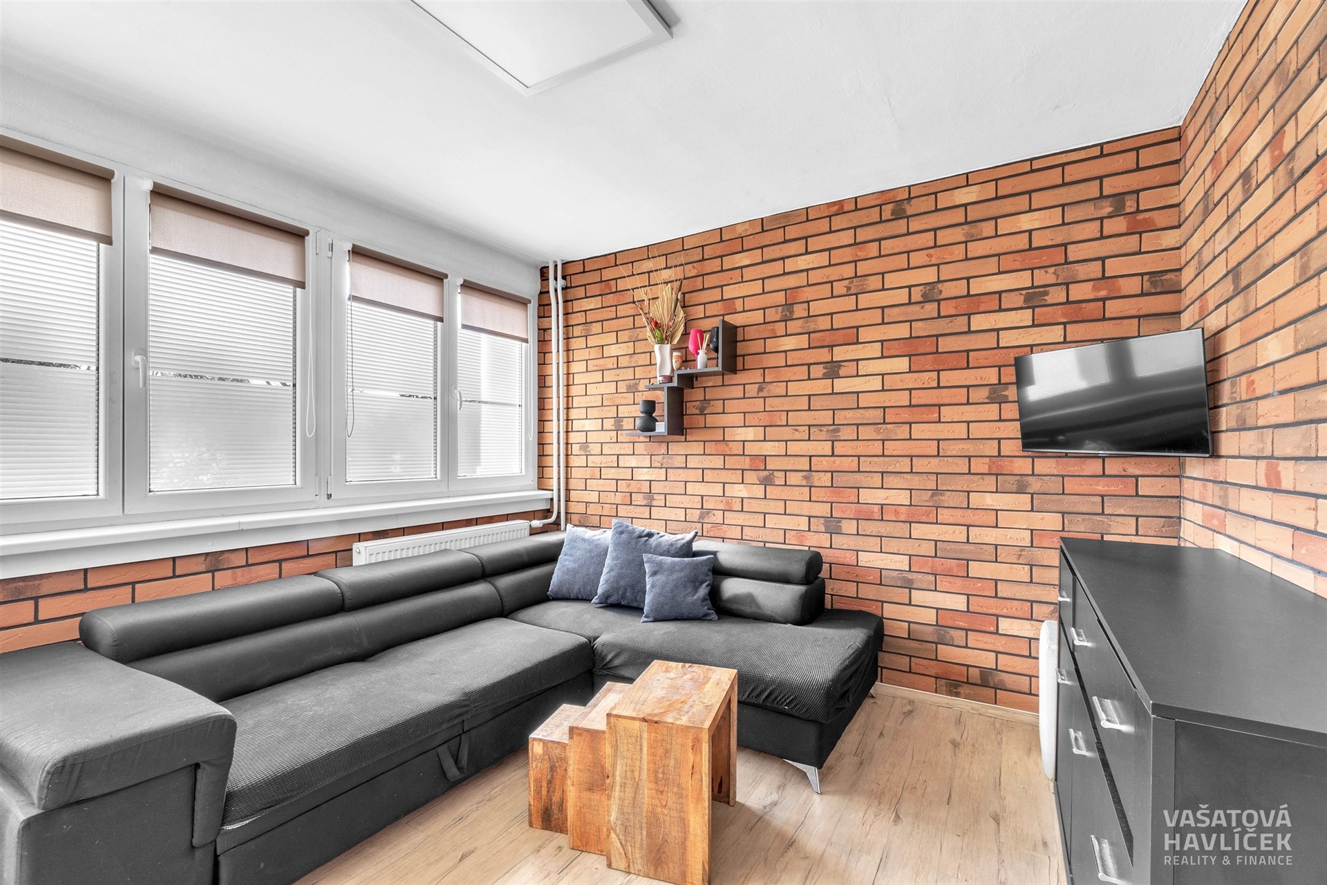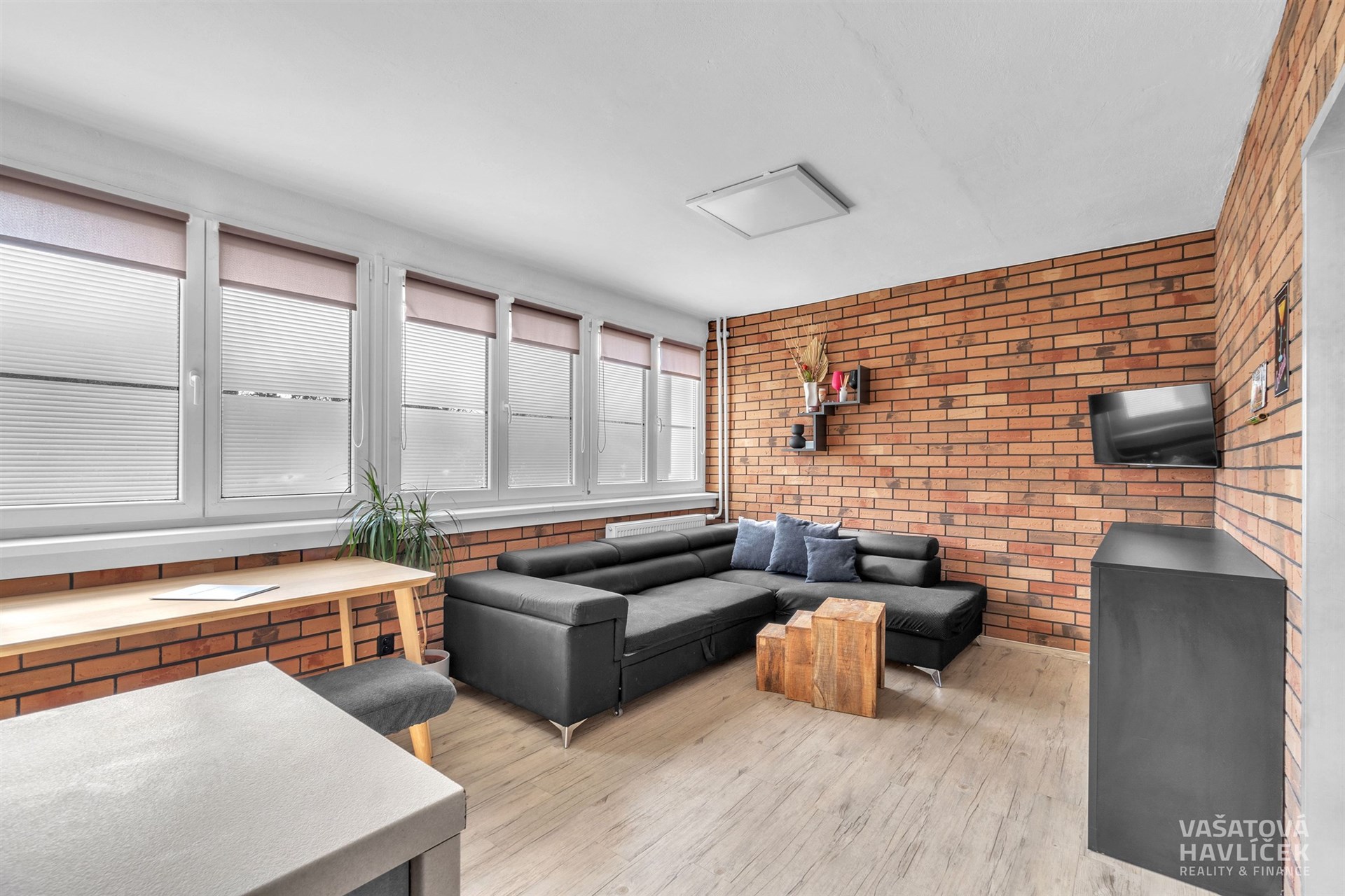 Dispozici bytu tvoří kuchyň propojená s obývacím pokojem, orientovaná na jihozápad. Dva pokoje, koupelna s vanou a záchodem je situována na severovýchod. Okna v této části bytu směřují do klidného vnitrobloku s parkem a dětským hřištěm. V předsíni je zhotovena vestavěná šatní skříň, která plní funkci šatny a zároveň nabízí prakticky řešený úložný prostor. V obytných místnostech jsou podlahy řešeny kombinací vinylu a plovoucí podlahy, v koupelně je položena keramická dlažba. V koupelně je instalováno podlahové vytápění.