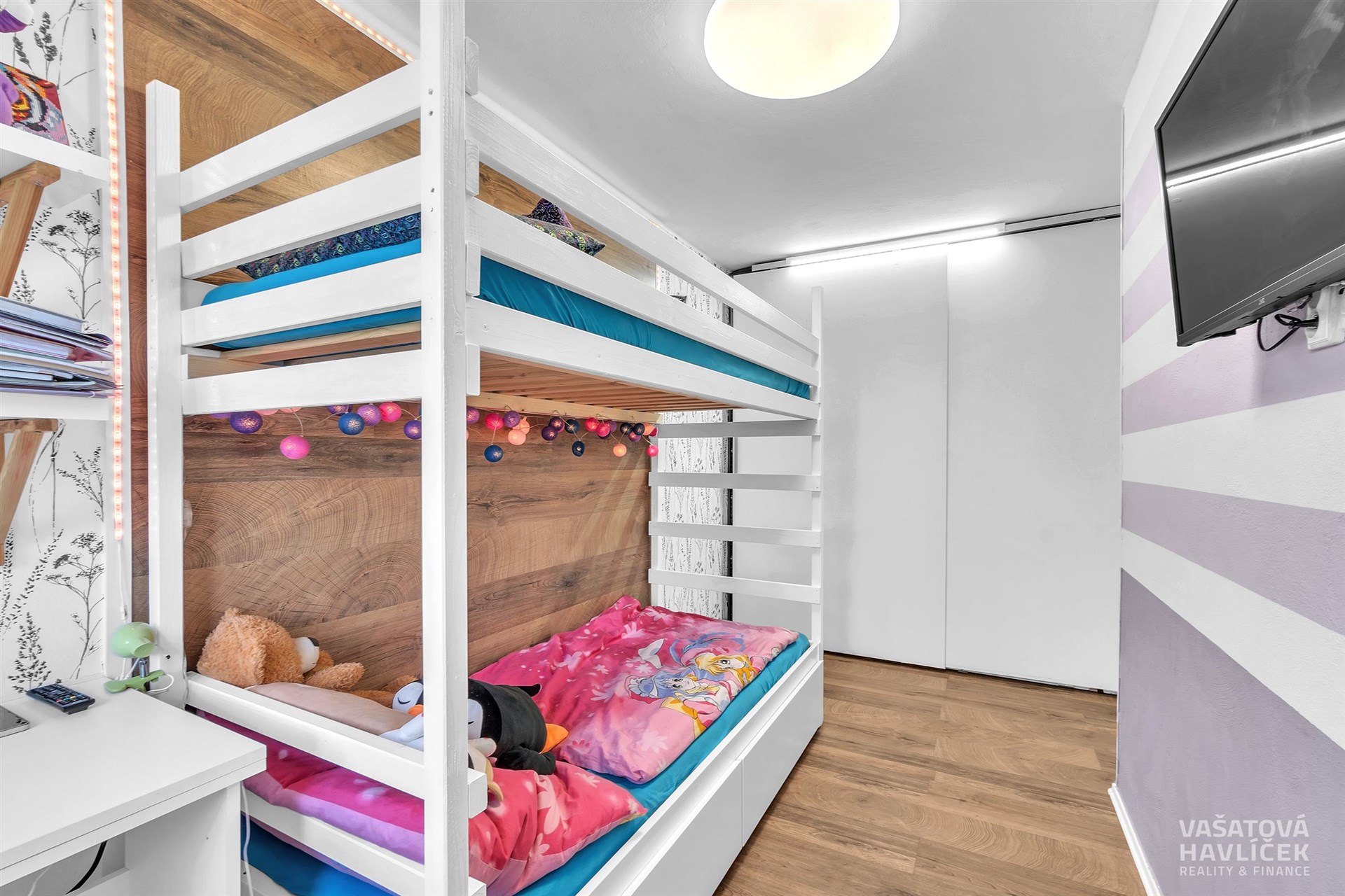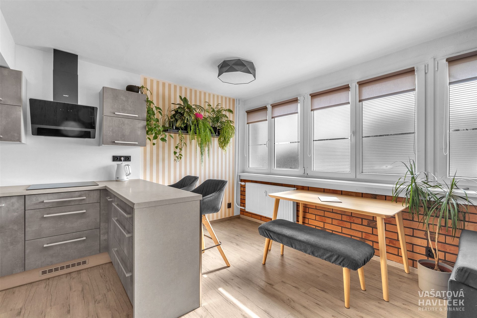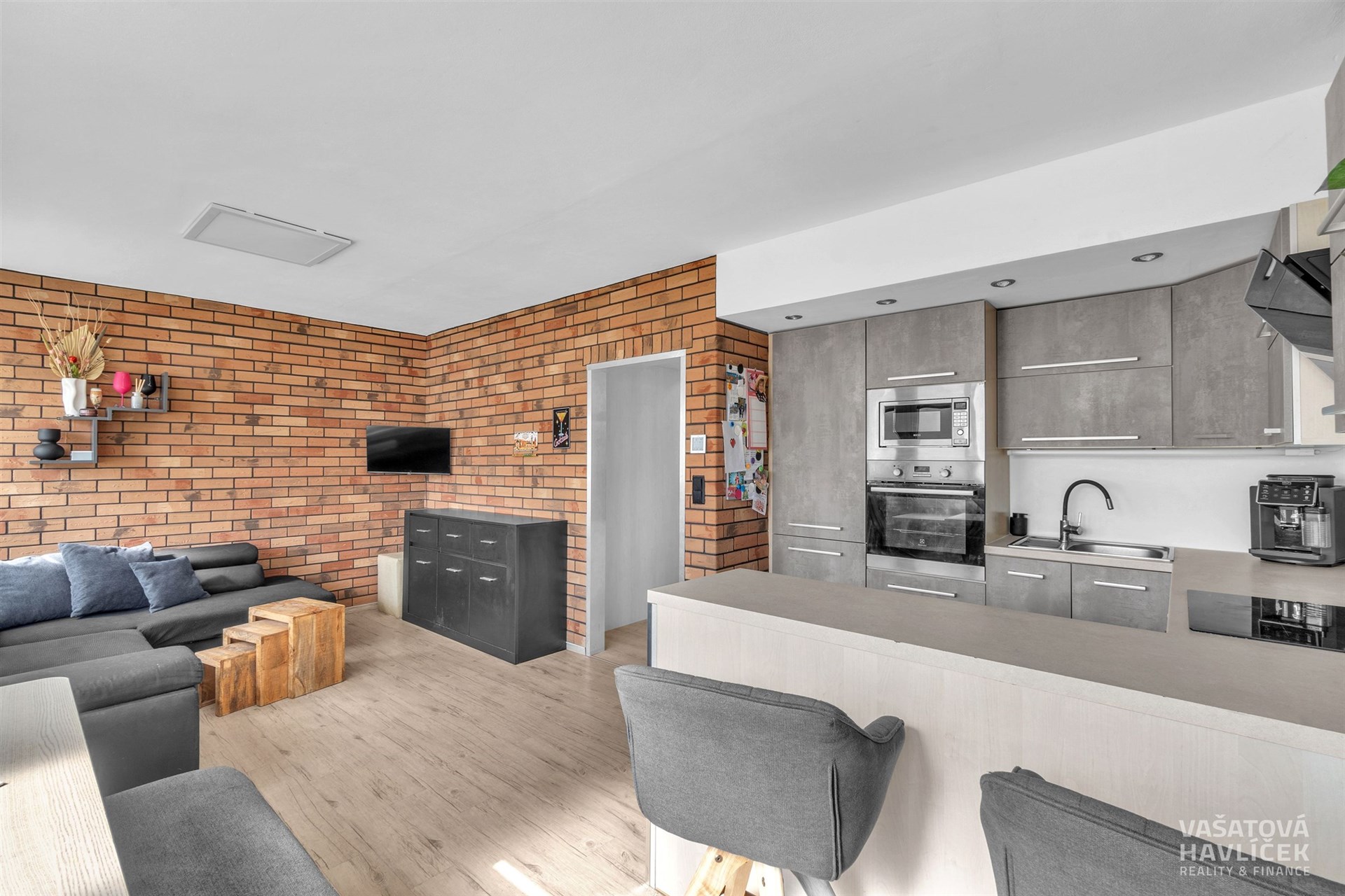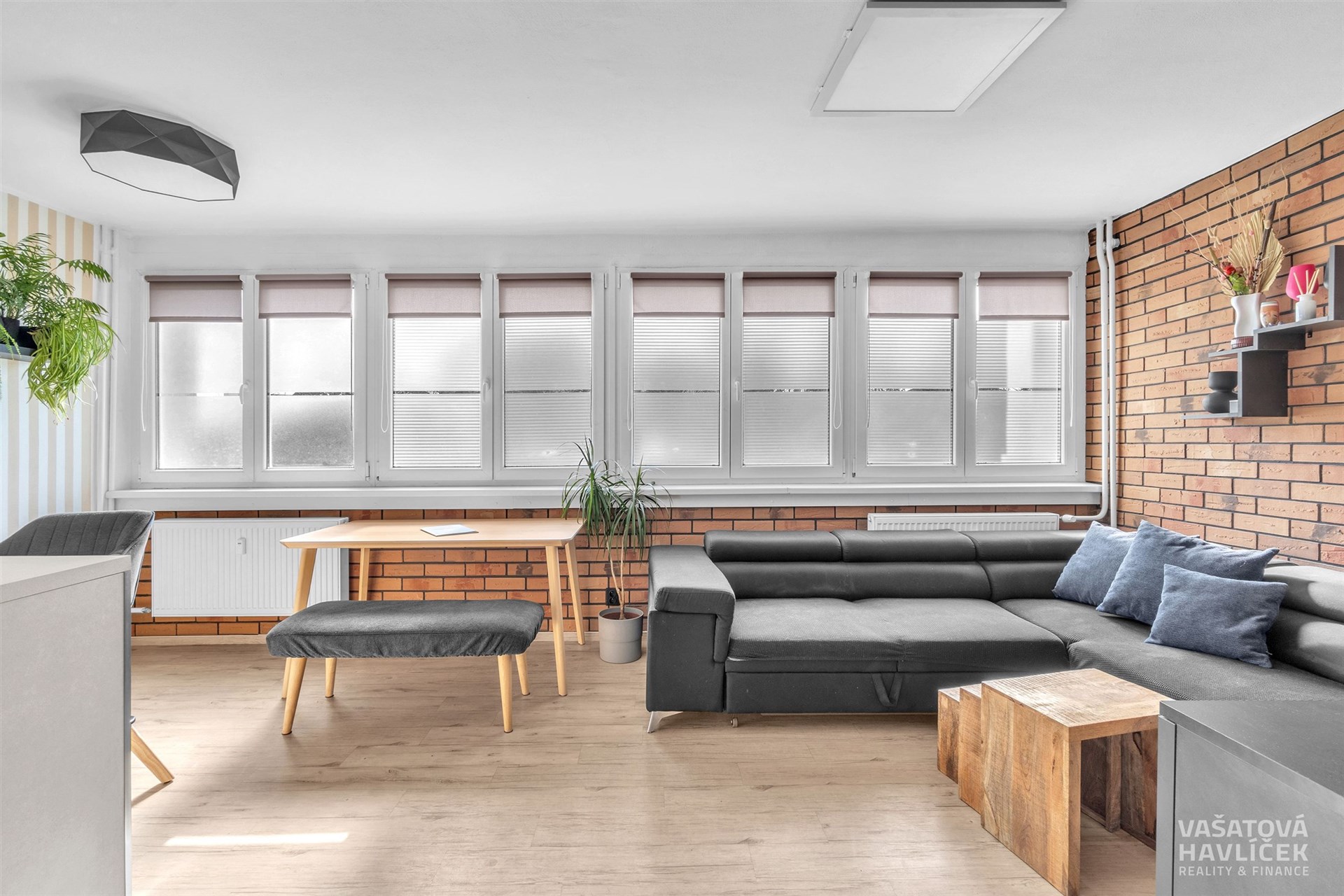 Dispozici bytu tvoří kuchyň propojená s obývacím pokojem, orientovaná na jihozápad. Dva pokoje, koupelna s vanou a záchodem je situována na severovýchod. Okna v této části bytu směřují do klidného vnitrobloku s parkem a dětským hřištěm. V předsíni je zhotovena vestavěná šatní skříň, která plní funkci šatny a zároveň nabízí prakticky řešený úložný prostor. V obytných místnostech jsou podlahy řešeny kombinací vinylu a plovoucí podlahy, v koupelně je položena keramická dlažba. V koupelně je instalováno podlahové vytápění.