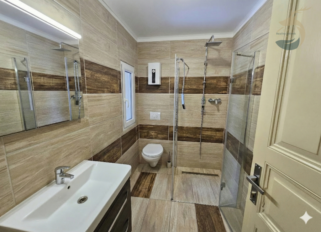 V patře jsou dva pokoje tvořené vždy dvěma vzájemně propojenými místnostmi a dále jeden centrální prostorný pokoj s balkonem a výhledem do okolní krajiny. Součástí patra je také druhá koupelna, která byla realizována v roce 2025, včetně instalace podlahového vytápění. Dispozičně patro nabízí celkem pět místností.