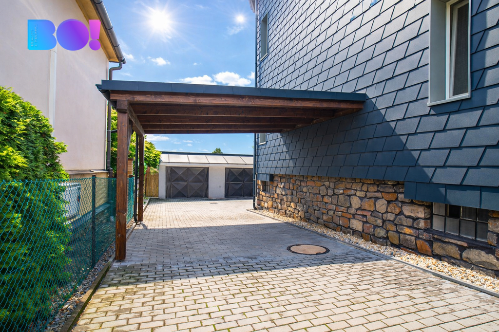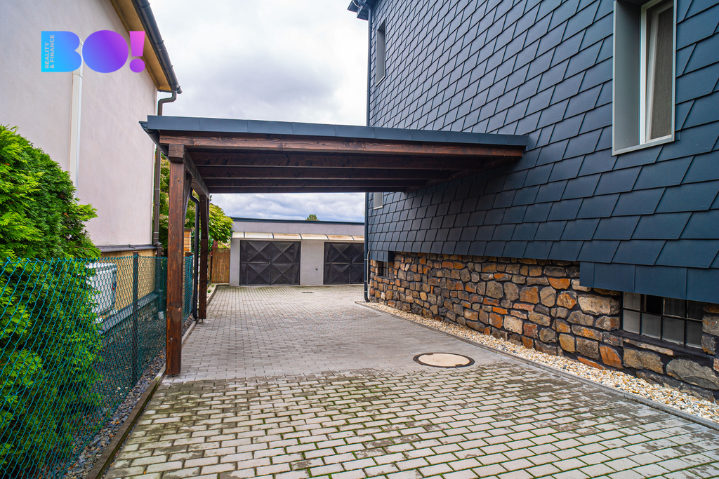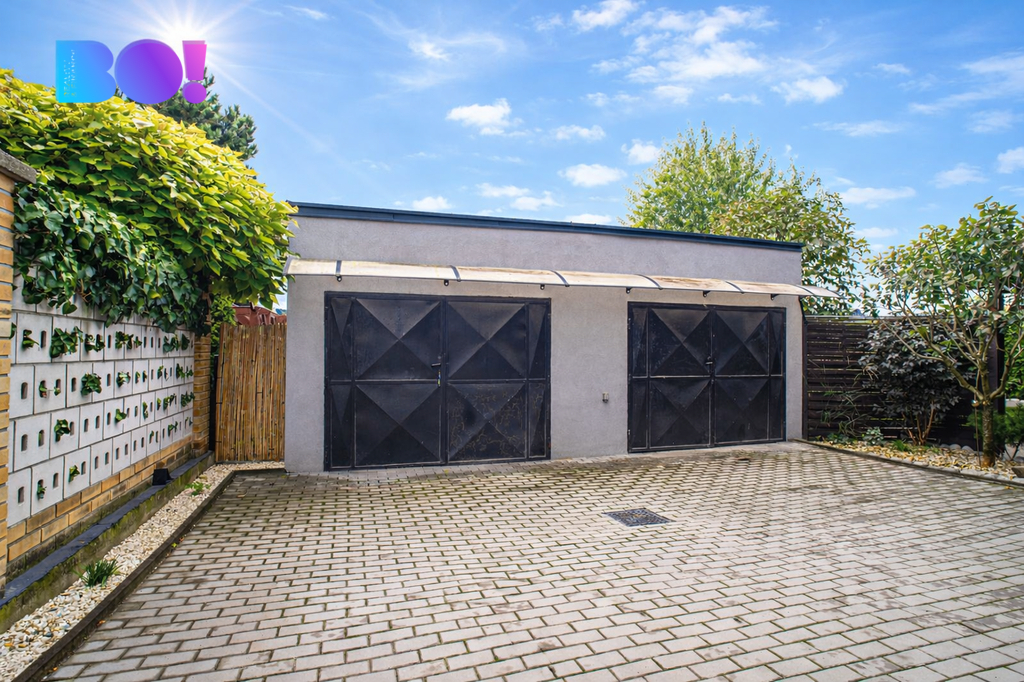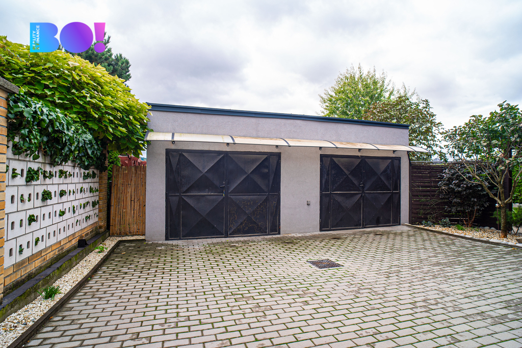 Na pozemku se nachází dvě garáže, k dispozici je také dostatek parkovacích míst přímo u domu.