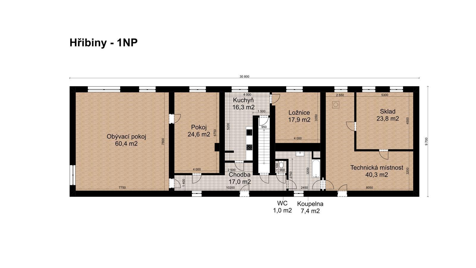 Obytná část (3+1): 196,5 m2 + podkroví vhodné k vestavbě