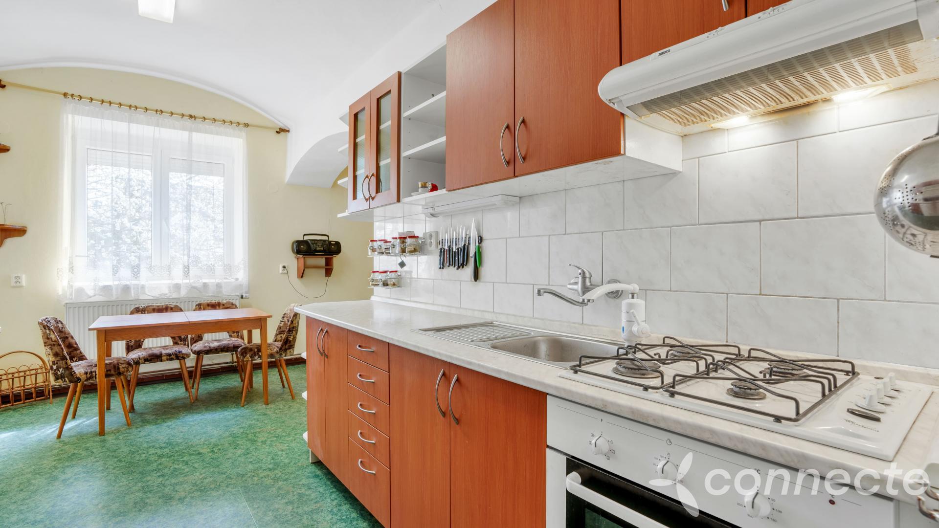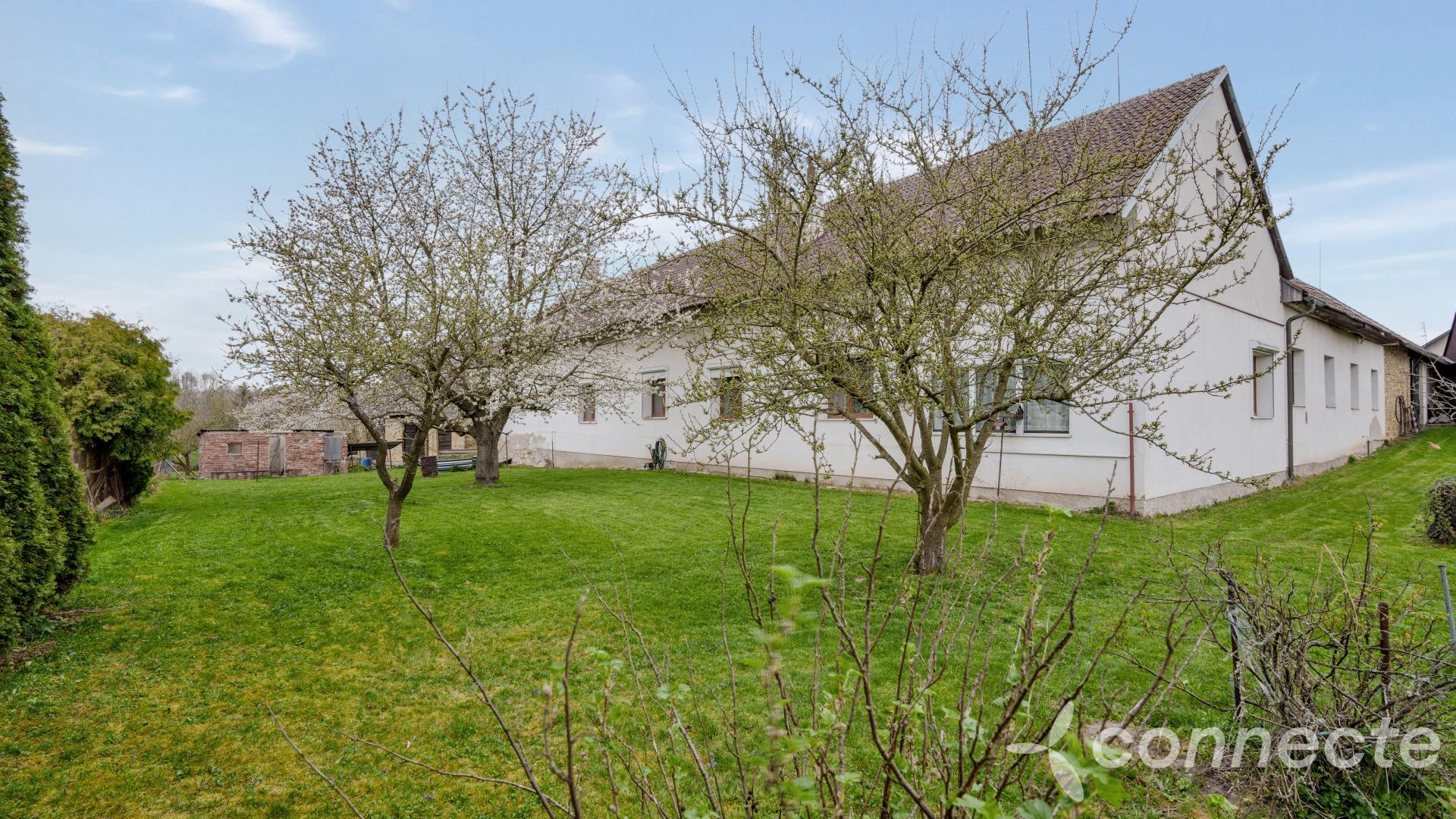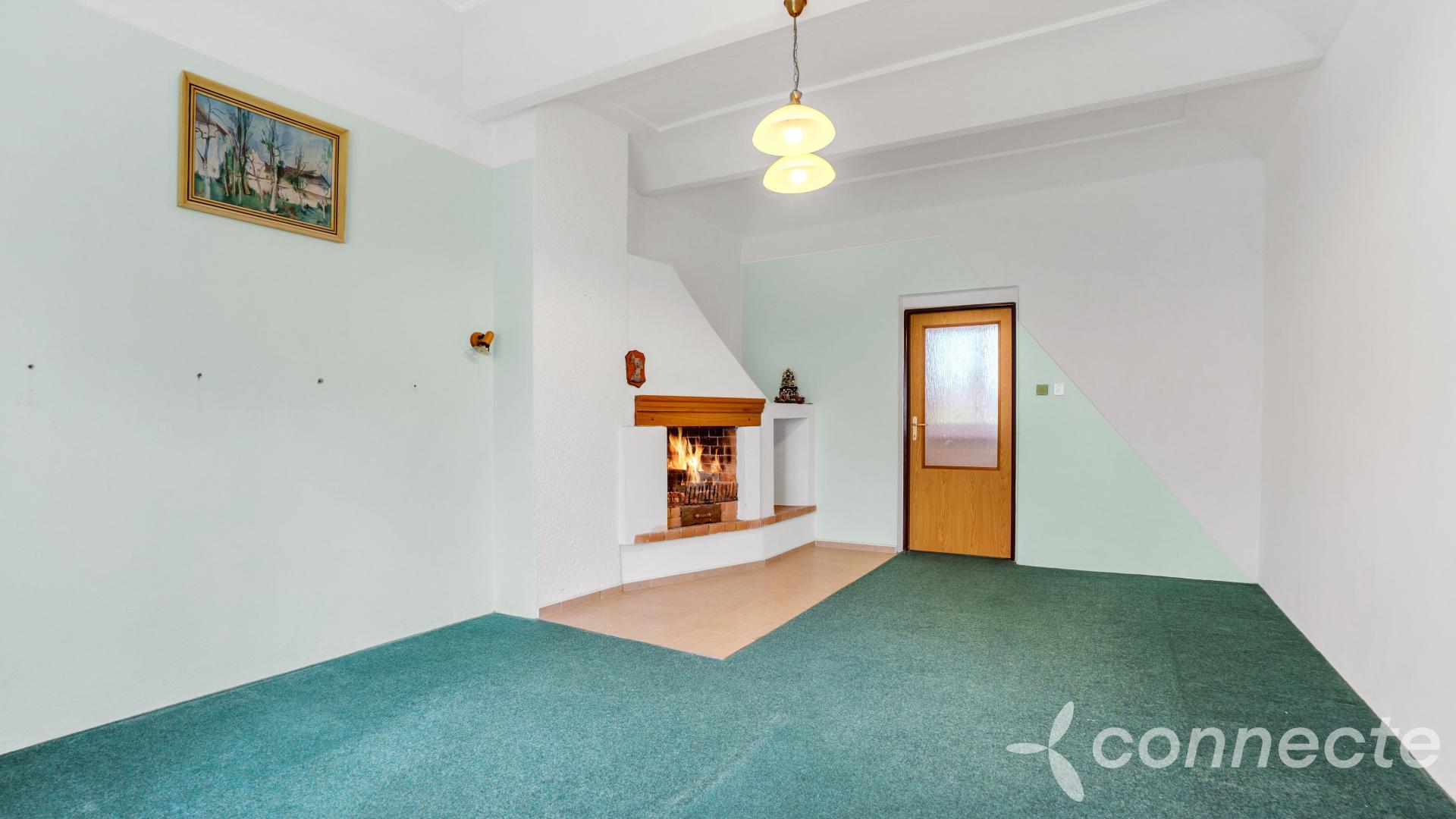 Dům má několik obytných a pracovních částí. Dispozice 3+1 zahrnuje mimořádně prostorný obývací pokoj o velikosti 60m2. V pokoji je okno připravené pro budoucí vstup na zahradu. Další pokoj o výměře 25m2 má vestavěný, plně funkční krb. Kuchyně o velikosti 17m2 má vstup do krásného klenutého suchého sklepa s vlastní studánkou. Koupelna (7m2) a WC 1m2. Z koupelny je vstup do velké kotelny 40m2, kde je plynový kotel, bojler, další úložné prostory. Další místnost v kotelně 24m2 + WC nabízí možnost přestavby na samostatnou bytovou jednotku 1+1 se vstupem z přední části domu vhodné například pro domovníka nebo firemní zázemí.